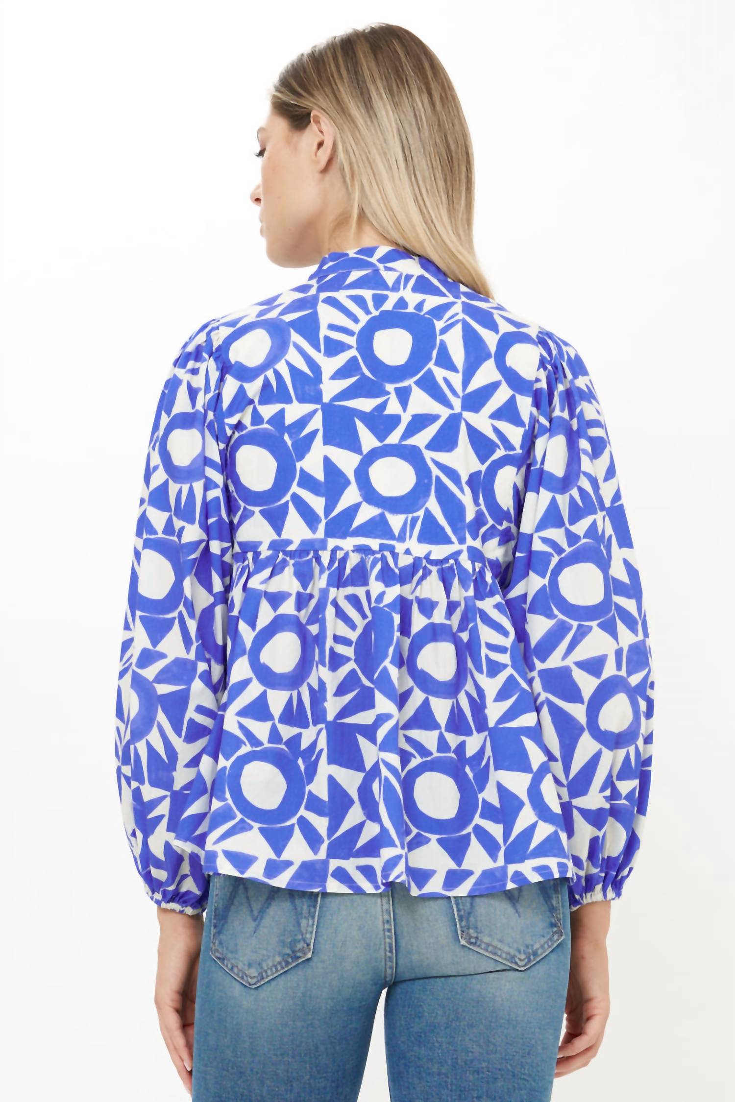 A timeless blouse that will never go out of style. Introducing the Mandarin Balloon Top by Oliphant, a chic addition in vibrant eclipse blue for your seasonal wardrobe. This blouse features long balloon sleeves and a sophisticated mandarin collar, crafted from soft and breathable cotton. The button closure ensures a secure fit while the minimalist pattern adds a stylish flair. For care, hand wash and lay flat to dry to maintain its elegant appearance.
