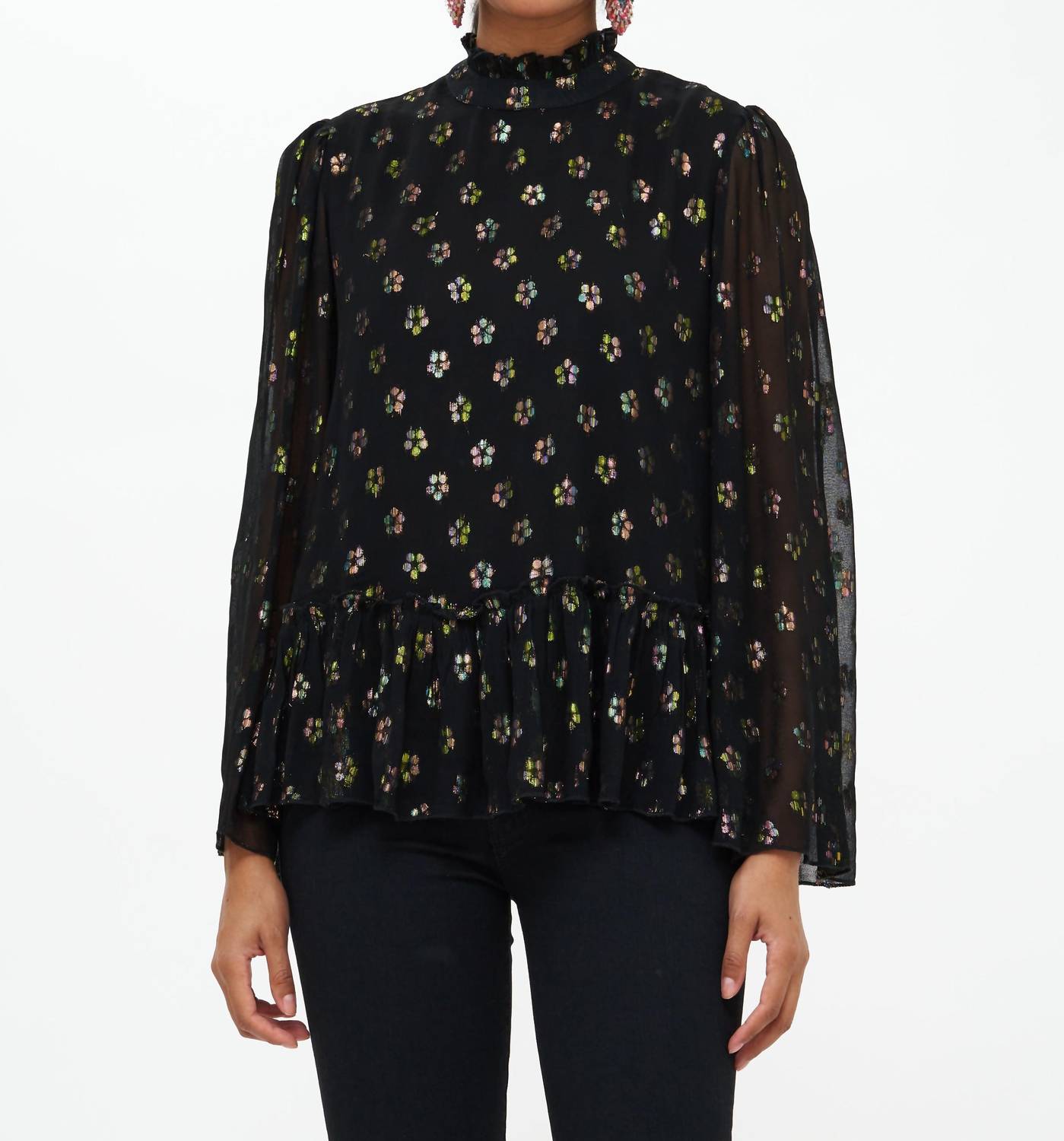 A versatile blouse that works from desk to dinner! Oliphant's Black Kala Peplum Blouse is an elegant addition to any wardrobe, marrying sophistication with playful grace. With long bell sleeves and a ruffle collar, this blouse features a flattering silhouette and textured fabric. Made from 100% Georgette with Gold Dot Lurex detailing, its back zip closure ensures easy wear. Care instructions: machine wash cold, hang to dry.