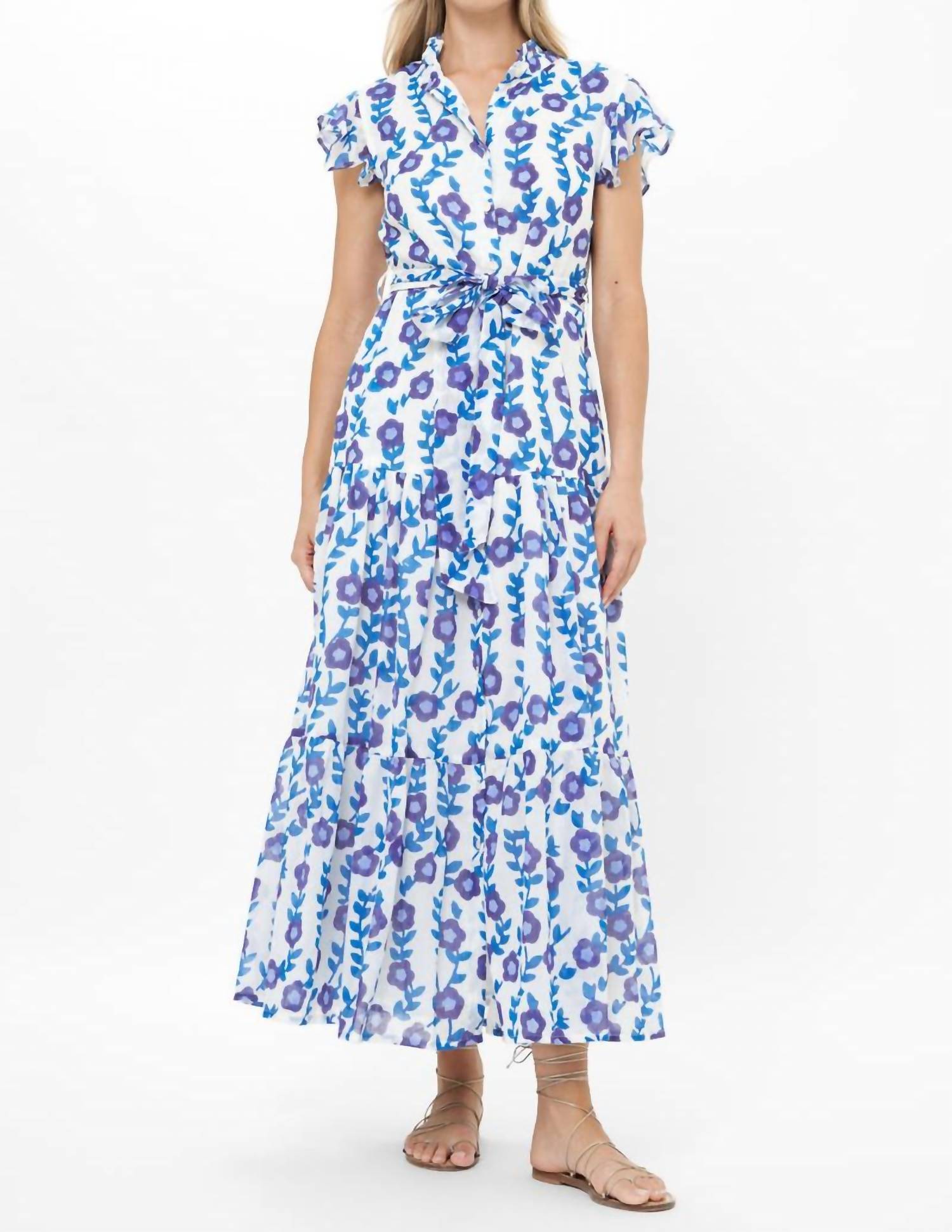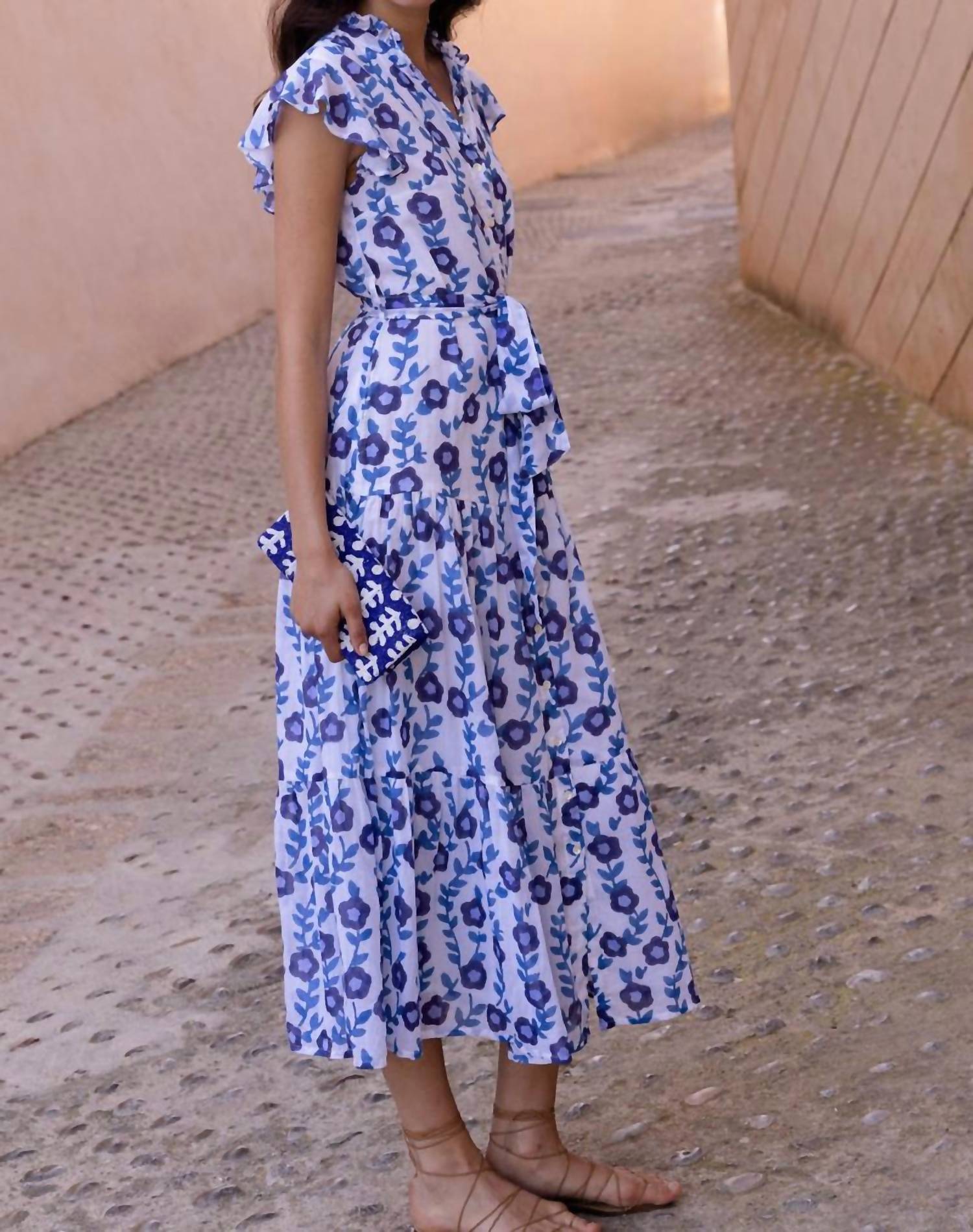 A maxi dress that is just as cute as it is comfortable. Introducing the Ruffle Collar Button Maxi Dress by Oliphant in Toscana Blue, a stunning choice for any occasion. This elegant maxi dress features cap sleeves and a feminine ruffle collar, perfectly combining style and comfort. Made from premium cotton, the dress includes a practical button closure and convenient pockets, enhancing its versatile appeal. Ideal for spring holidays or boho chic events, this floral A-line silhouette will make you feel effortlessly graceful.