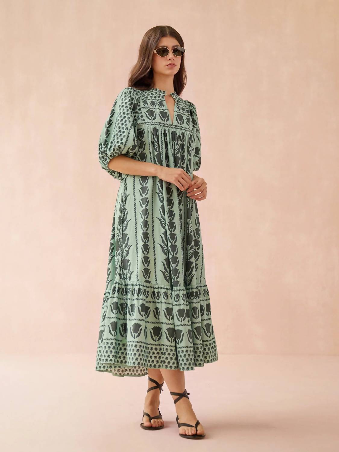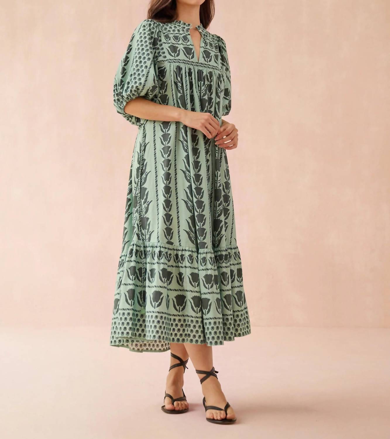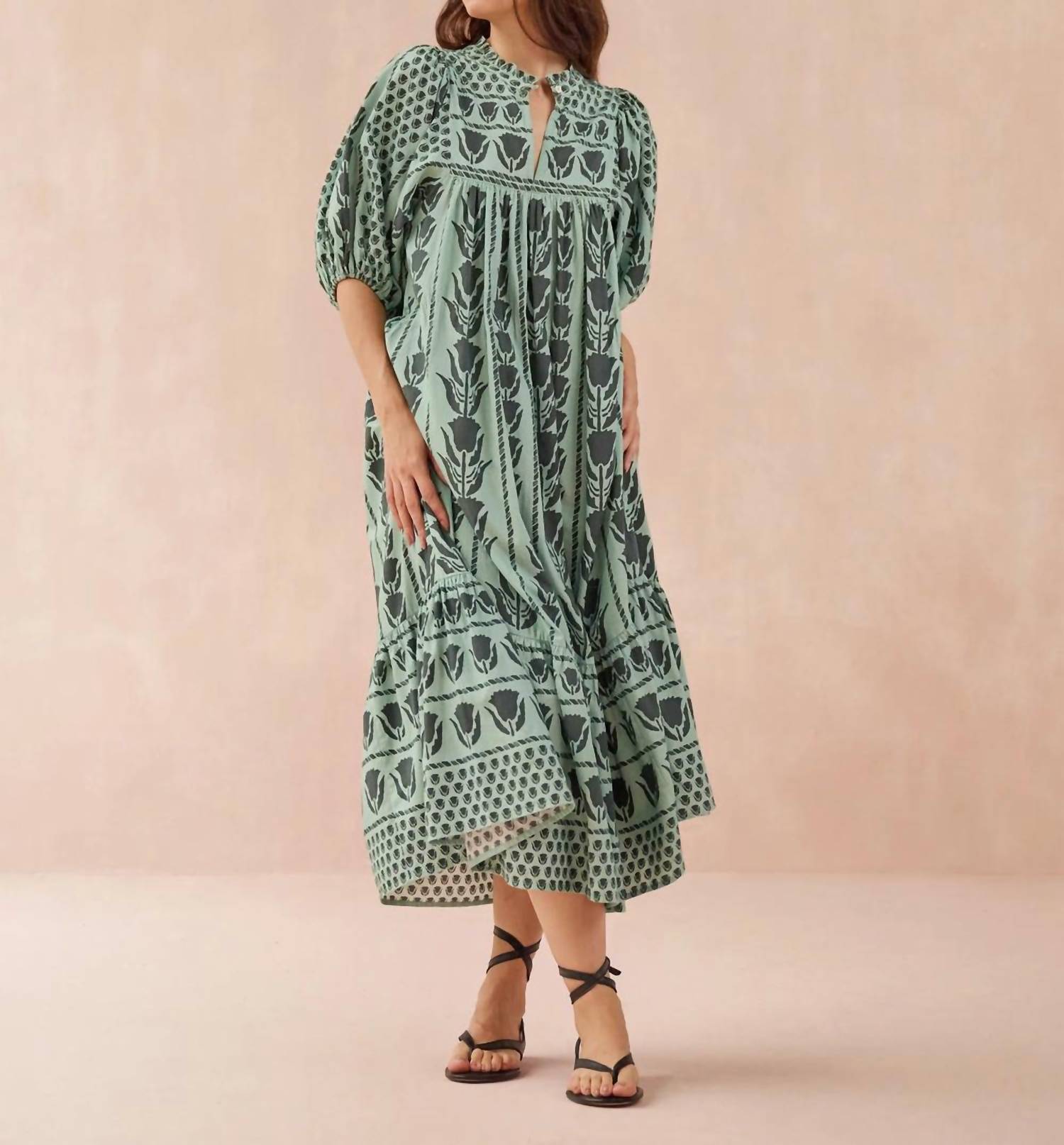 Just add slides or mules and you are good to go. Experience a touch of paradise with the Wren Midi Dress by OMIKA in vibrant Papaya. This patterned, cotton dress boasts statement puff elbow sleeves and a chic shift silhouette, making it the perfect boho chic addition to your summer wardrobe. Length is 50" from size S with a flattering V-neck and a neckline slit of 5 3/4". The pull on closure enhances its effortless style, complete with a removable belt for versatile wear. Care: Machine wash, line dry.