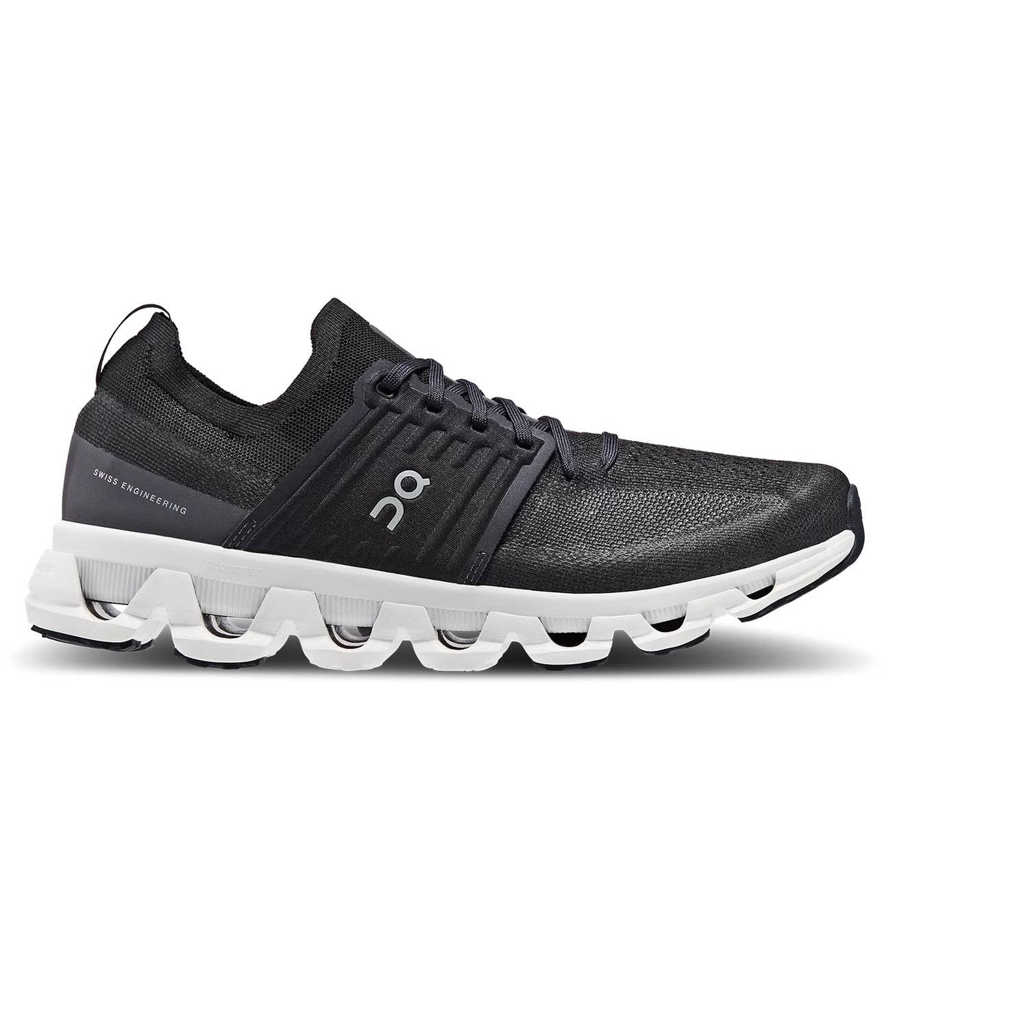 Elevate your running game with the Men's Cloudswift 3 Running Shoes by On in sleek All Black, meticulously crafted for performance and style. Engineered in Vietnam, these shoes feature a zonal knit sock-like upper with 3D heel padding, offering adaptive comfort and support for various foot shapes. Benefit from dual-density Helion™ superfoam combined with an updated CloudTec® midsole, ensuring optimal cushioning on hard surfaces, with a platform heel for added lift. Designed with a 5mm drop and medium width fit, these shoes weigh 290g and are perfect for spring fitness workouts, embodying athleisure trends with a round toe design.