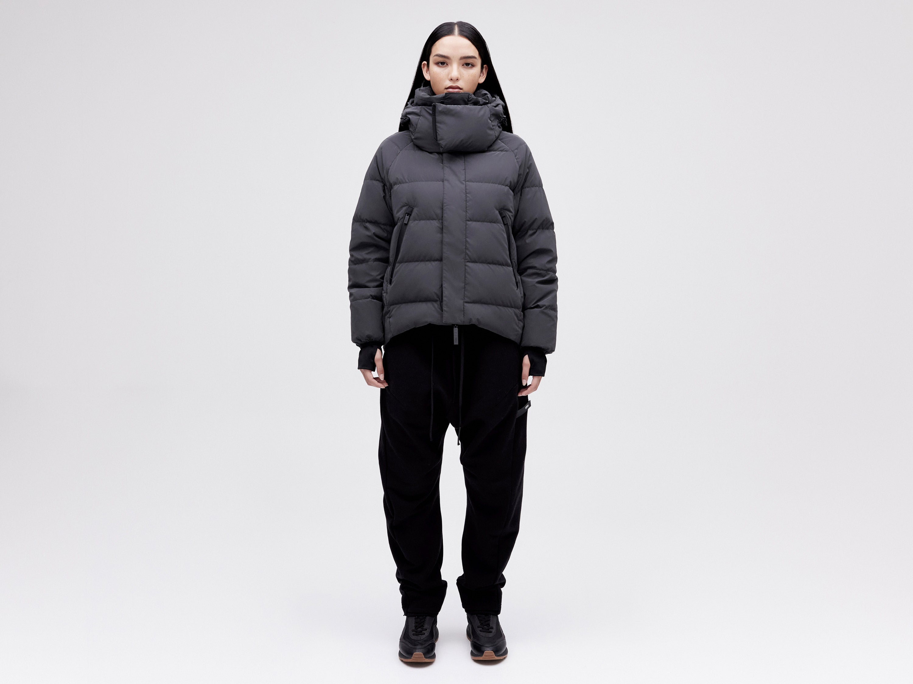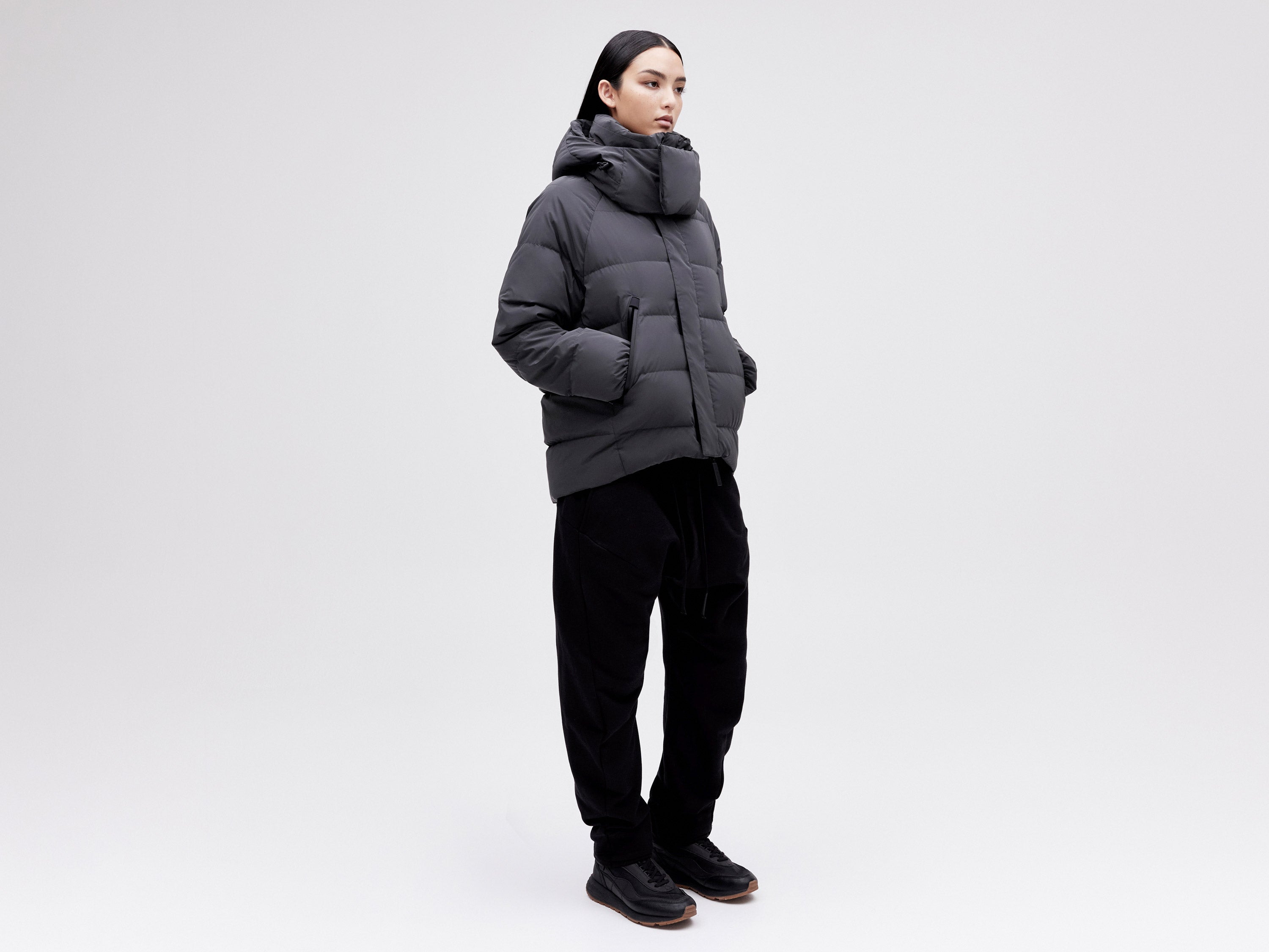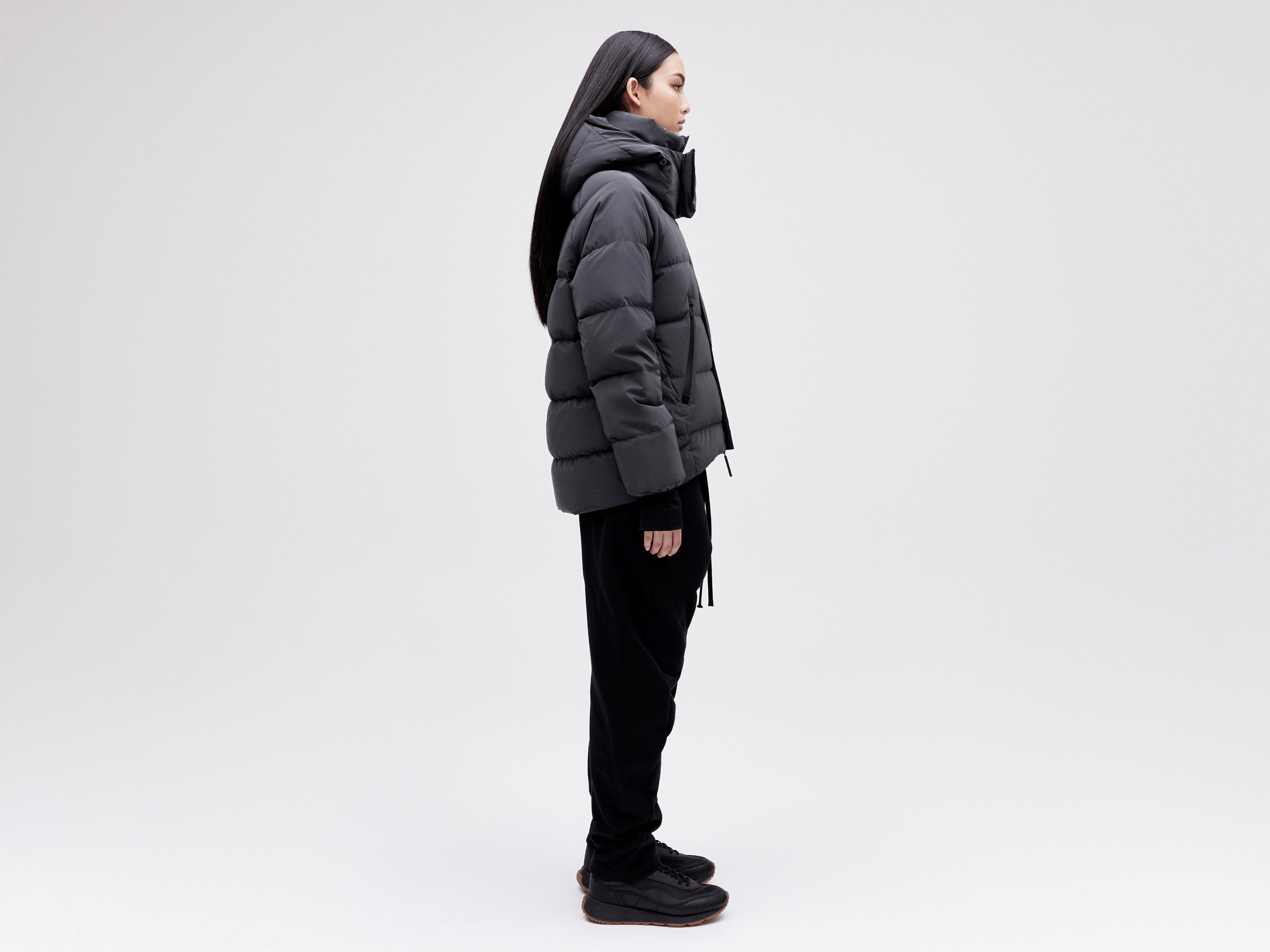 Our On/Off Hood O.S Down Jacket is made from a polyester canvas featuring a resin coating impregnated with thousands of micro-glass spheres creating a hyper-reflective surface appearance. With a classic relaxed fit, the adjustable waist straps and detachable hood with magnetic fastenings provide both practical and dynamic styling options.