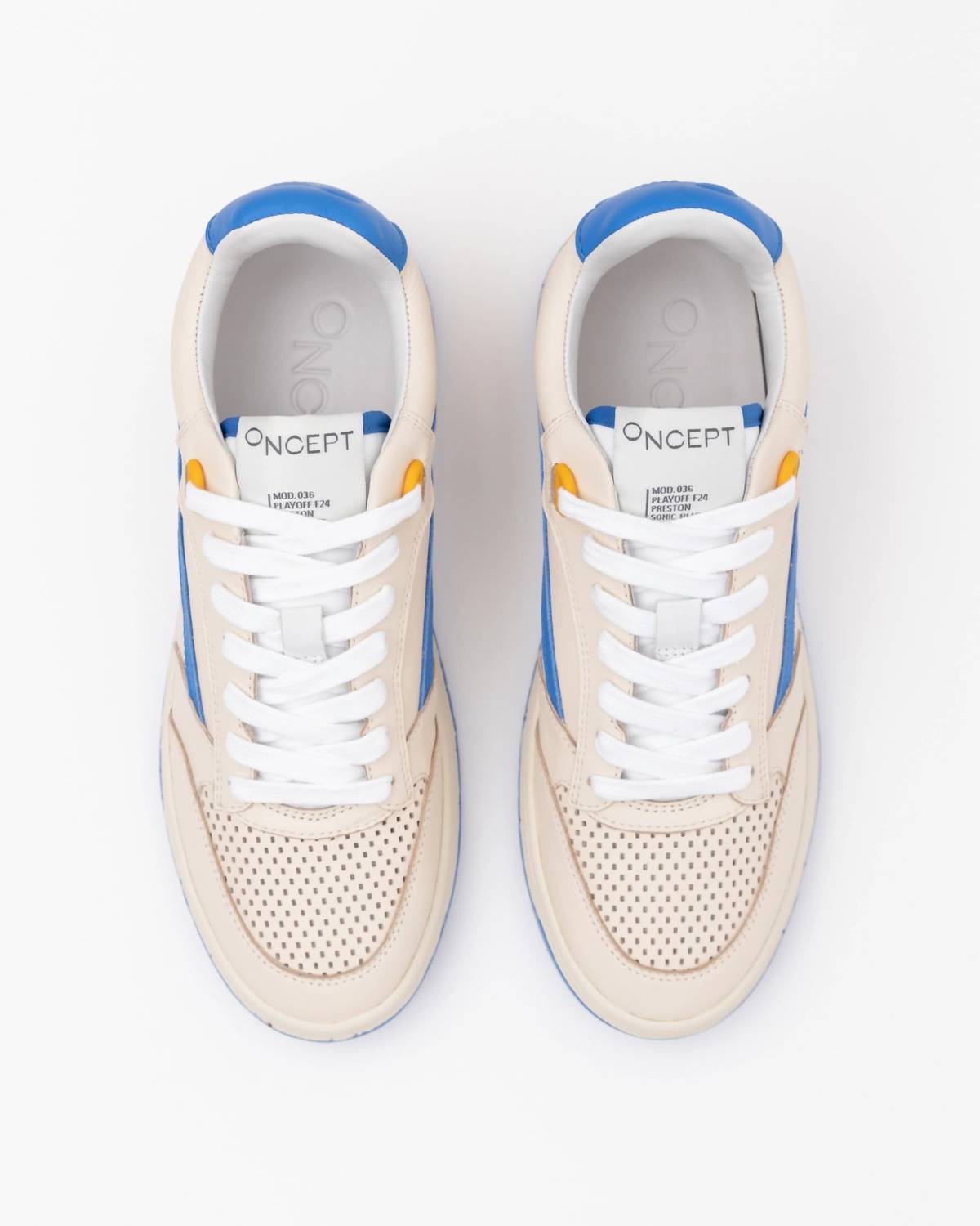 Step into nostalgia with the Women's Preston Sneakers by Oncept, designed to bring 90s fashion to contemporary travel. Featuring a soft calf leather upper and a round toe, these blue sneakers offer both comfort and style. With an environmentally-friendly Tencel pulp based twill lining and a bio-density molded footbed made from recycled materials, they align with Oncept's commitment to sustainable fashion. Perfect for spring getaways and 4th of July celebrations, the Preston Sneakers provide a flat heel and re-speckled bottom for all-day comfort and flair.