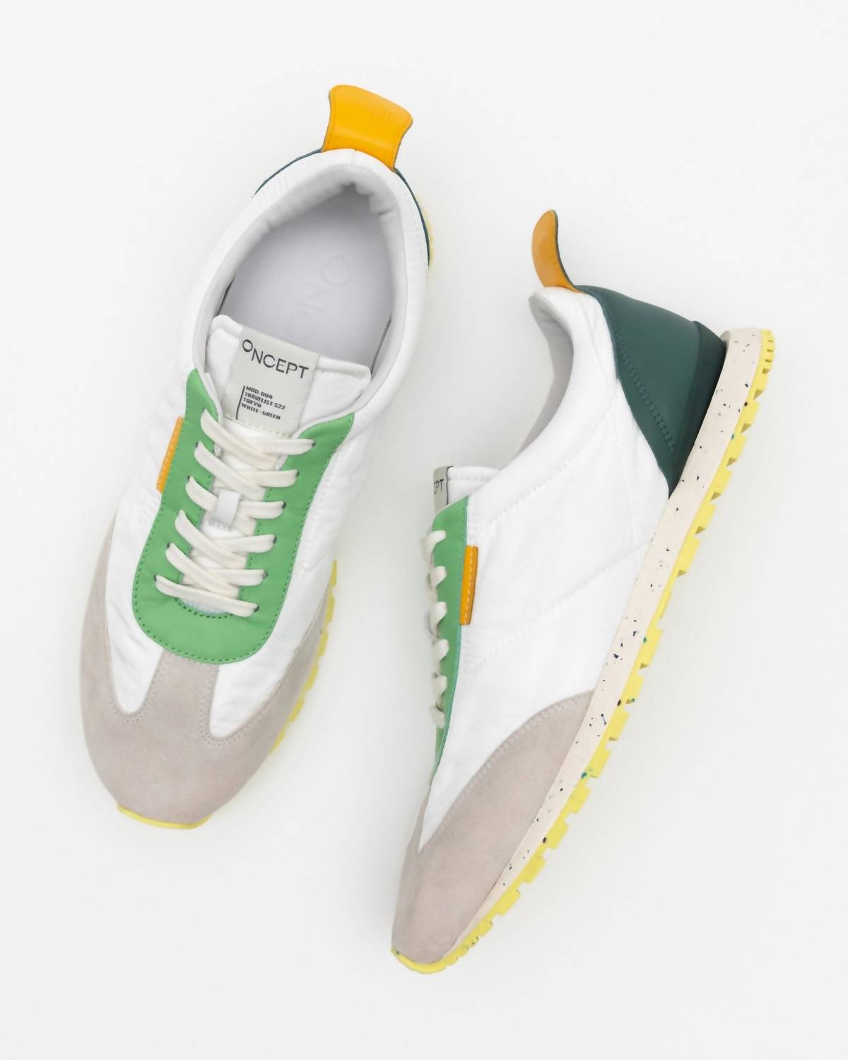 When fashion and function come together seamlessly. Discover the Women's Tokyo Sneakers by Oncept, the perfect blend of retro style and modern sustainability. These sneakers feature plush recycled water-resistant nylon and chrome-free suede with a re-speckled midsole, combined with Tencel twill linings for extra comfort. Designed in a chic White Green hue, they boast a flat heel and round toe for a streetwear-inspired look ideal for spring travel. Made for women who love to explore ethically, these sneakers ensure you tread lightly and stylishly.