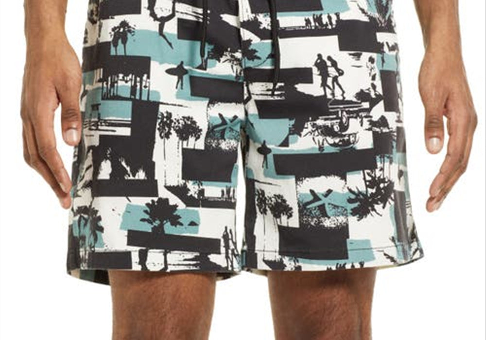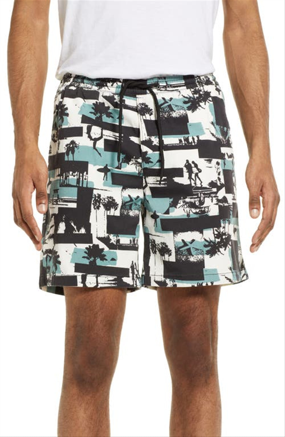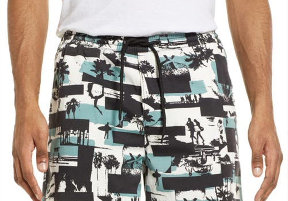 Cós elástico ajustável | Estampa de colagem vibrante | Tamanho extragrande | Material de algodão confortável | Dois bolsos laterais | Fácil lavagem à máquina | Tecido de secagem rápida | Estilo casual | Cor branco-azulado versátil | Produto exclusivo da Nordstrom