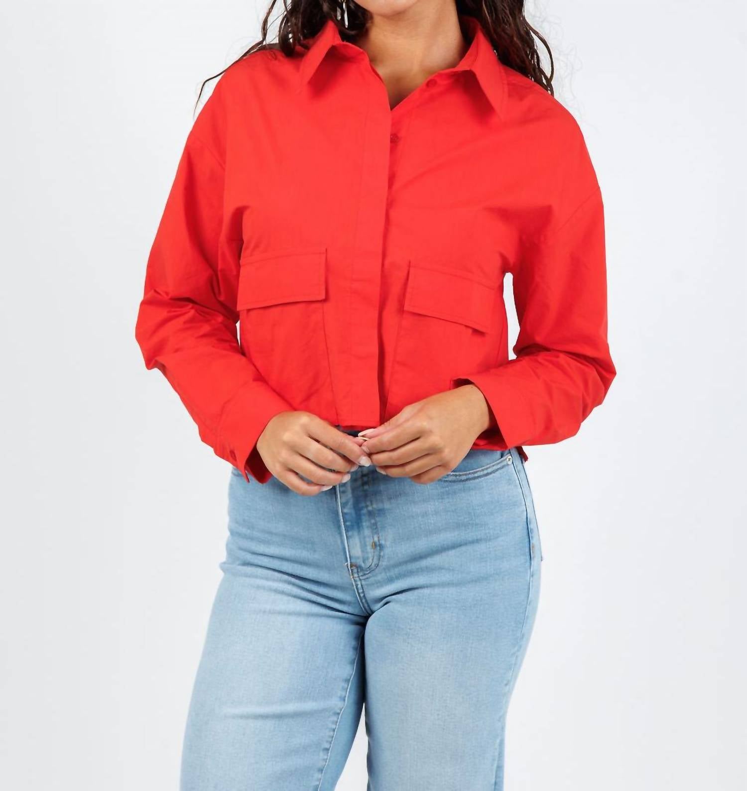 A timeless blouse that will never go out of style. Introducing the Women's Crop Boxy Blouse by Oui in striking Lipstick Red, a versatile addition to any wardrobe. With long sleeves and a classic shirt collar, this piece offers a unique blend of structured tailoring and casual flair. Made from 100% cotton, its design features a boxy silhouette and a slightly dropped shoulder, enhanced by a concealed button closure. Perfect as a jacket or blouse, pair it effortlessly with denim or high-rise trousers for chic versatility. Model wears a size 4 (Kira: 5'6", 34" bust, 25" waist, 34" hips).