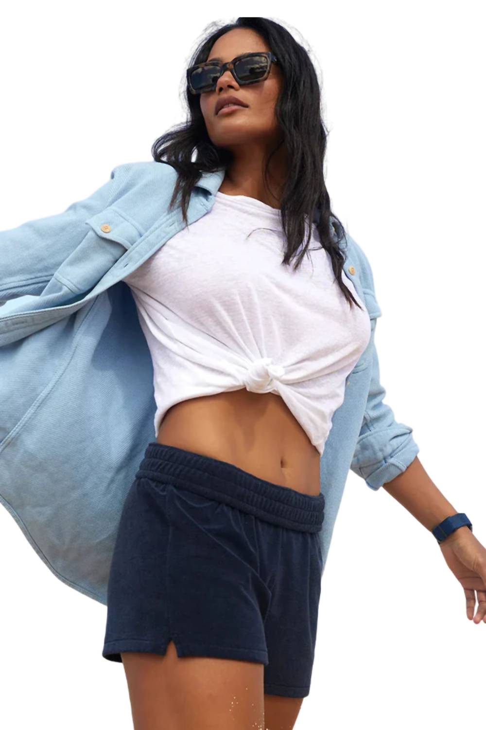Abrace a combinação perfeita de conforto e estilo com esta bermuda feminina da moda, habilmente desenhada para oferecer um caimento elegante e versatilidade. Shorts de inspiração retrô, confeccionado em tecido felpudo macio. Cós elástico, aberturas laterais na bainha. Lavagem à máquina com água fria. 57% poliéster reciclado, 43% algodão orgânico.