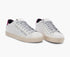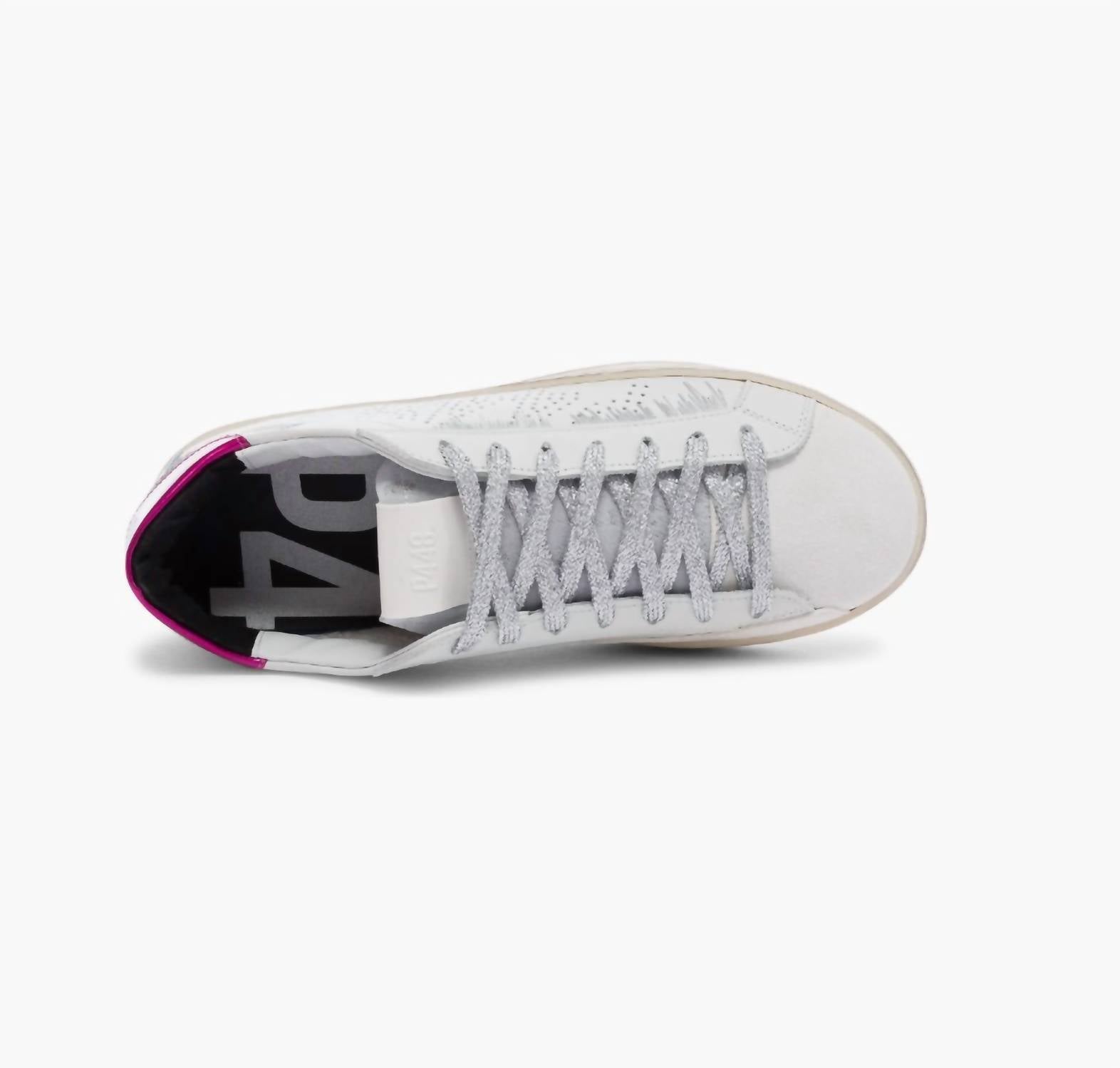 Step into style with the Women's John Goblin Sneaker by P448, designed for those who love a touch of standout flair. These sneakers feature a sleek white leather upper, accented with contrast silver stitching and a distinctive fuchsia matte leather heel tab. Complete with a grey embossed fabric tongue and perforated P448 logo, they offer exceptional comfort through a memory foam insole. Perfect for a casual streetwear look, the flat heel design ensures practicality without sacrificing style. Make a statement this summer with these eye-catching sneakers.