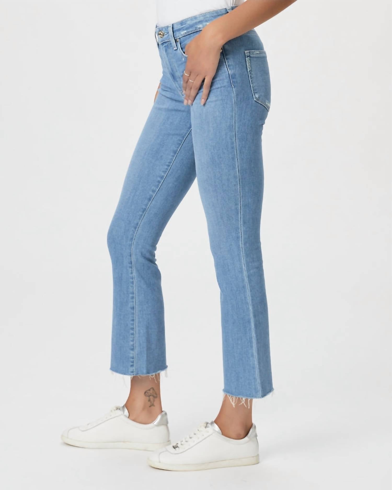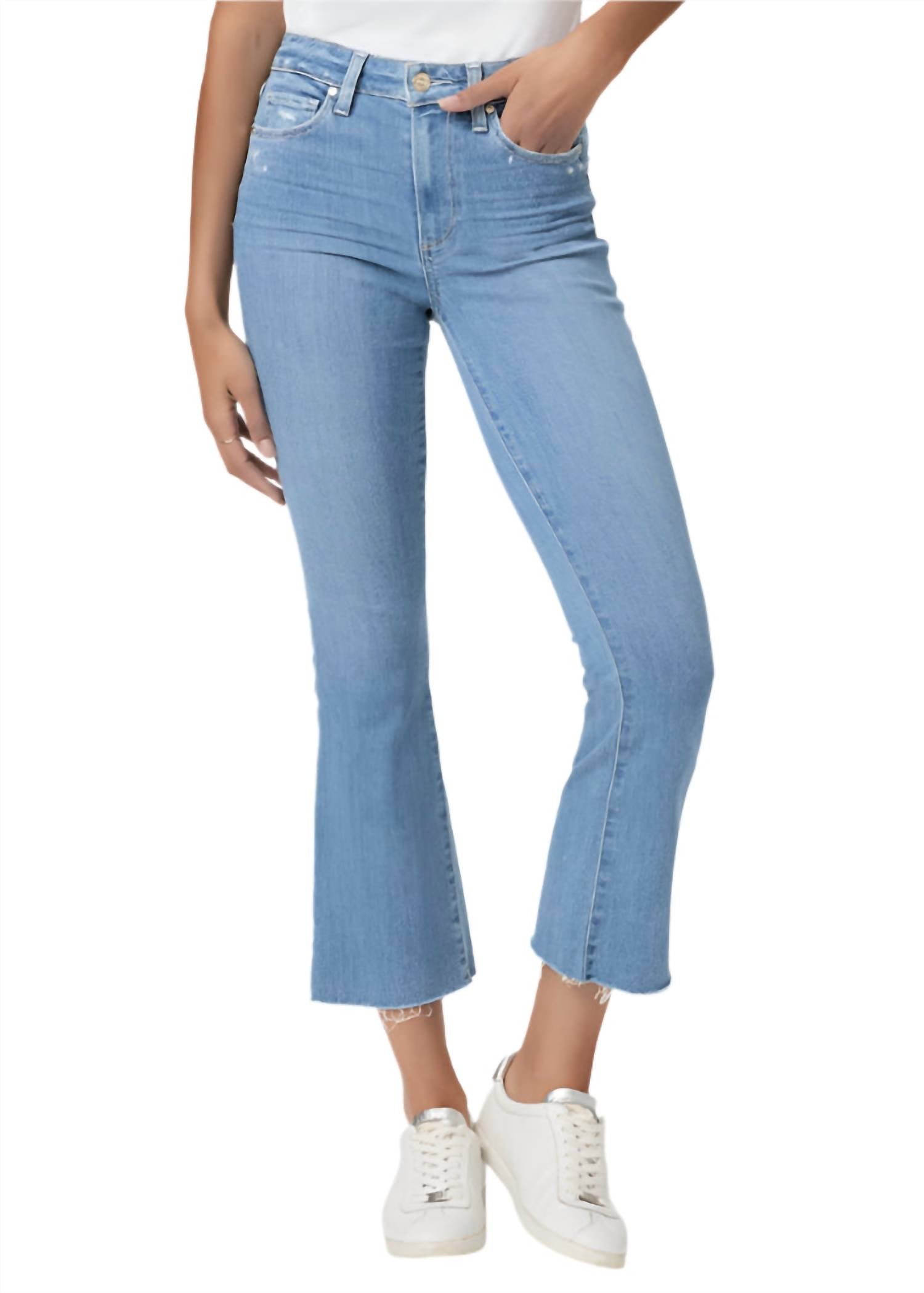 Discover the Colette High Rise Crop Flare Jeans by Paige, a stylish choice for a modern streetwear look. Designed in a solid pattern, these denim jeans feature a high-rise, slim-fit waist that leads to a flared leg, with a button closure for secure wear. The light wash with subtle distressing and a destructed hem adds a touch of vintage charm, made from TRANSCEND VINTAGE denim for superior comfort and stretch. Ideal for spring vacations, these jeans are machine washable and can be tumble dried, offering both style and easy maintenance.