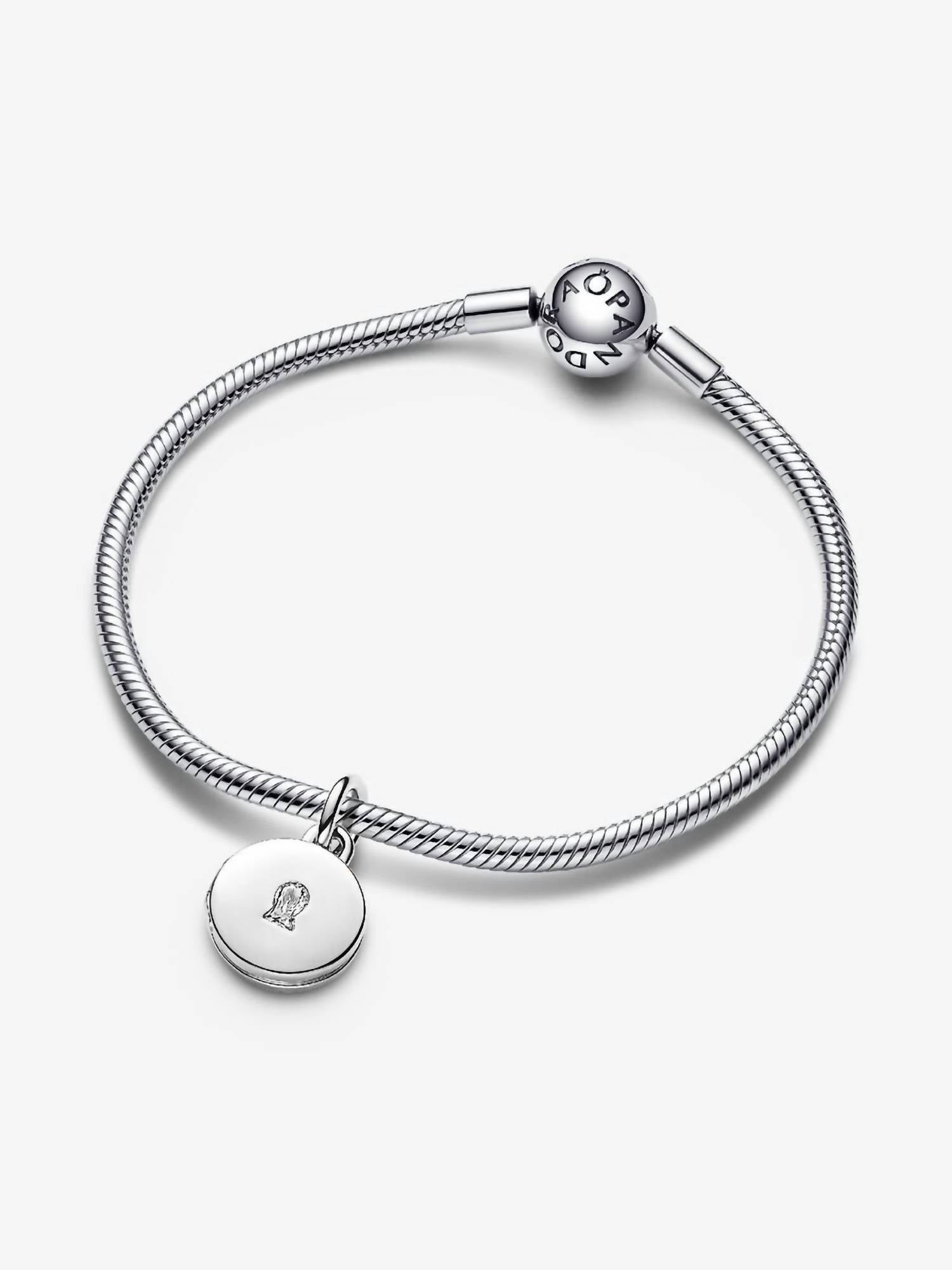 Keep what's most dear to you close to your heart with the Openable & Engravable Love Locket Dangle Charm. This sterling silver locket charm features a clear cubic zirconia stone on the front in the shape of a keyhole, and opens and closes securely so you can keep a tiny picture, note or lock of hair inside. The inside of the locket is engraved with the message "TODAY TOMORROW ALWAYS", and the back is blank for your own engraving. Wear it on your Pandora Moments necklace or bracelet as a symbol of keeping your love safe and a reminder to cherish it, every day. charm only
