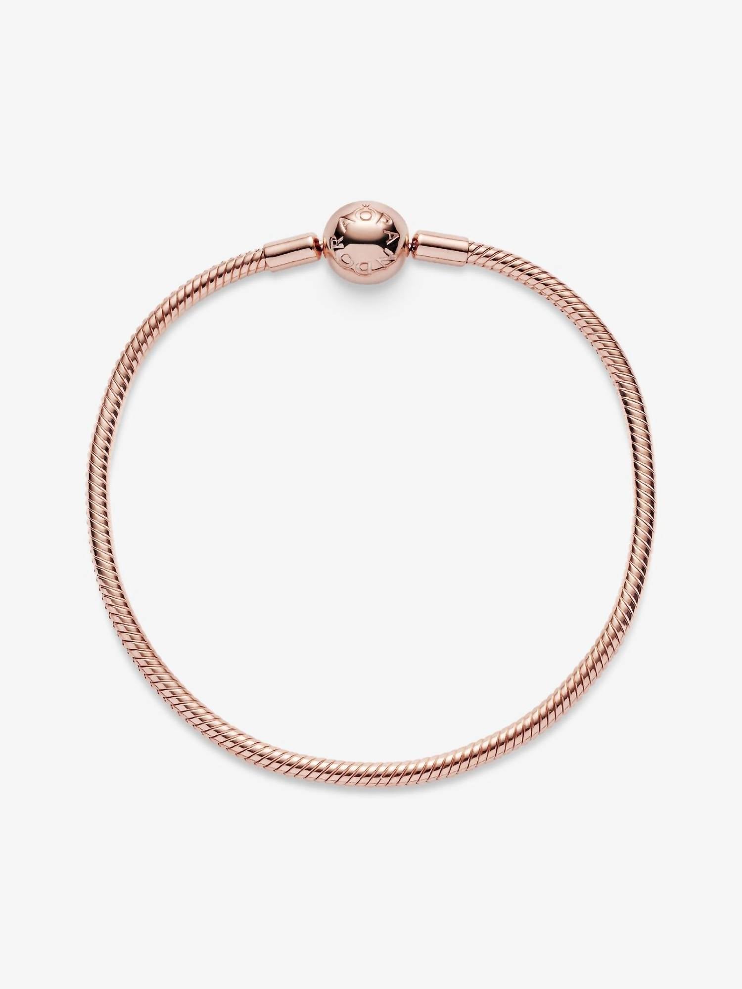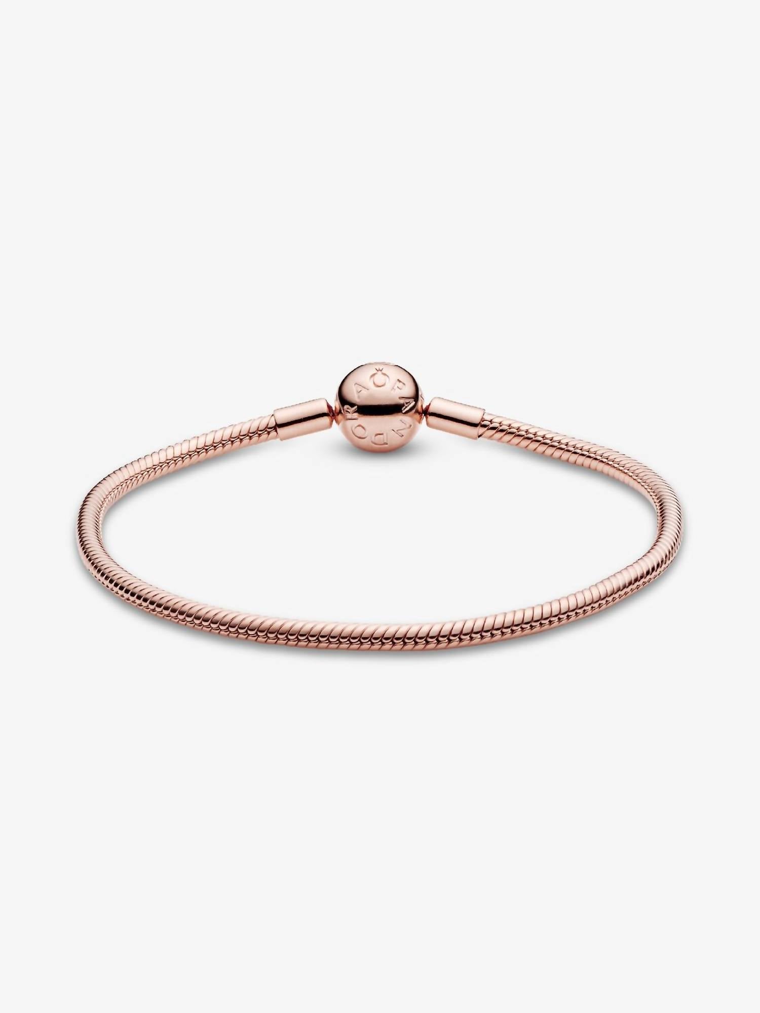 This stand-out bracelet is good enough to wear on its own, or stacked with your favorites. Discover the Pandora Moments Snake Chain Slider Bracelet, a timeless piece that brings sophistication to the classic friendship bracelet. Hand-finished and plated in 14k rose gold, this bracelet showcases one fixed and one movable end cap adorned with shimmering stones. The adjustable sliding lobster clasp ensures a perfect fit, crafted with sterling silver and plated in 14k rose gold. Style this fashion jewelry by adding your favorite Pandora charms for a personalized touch.