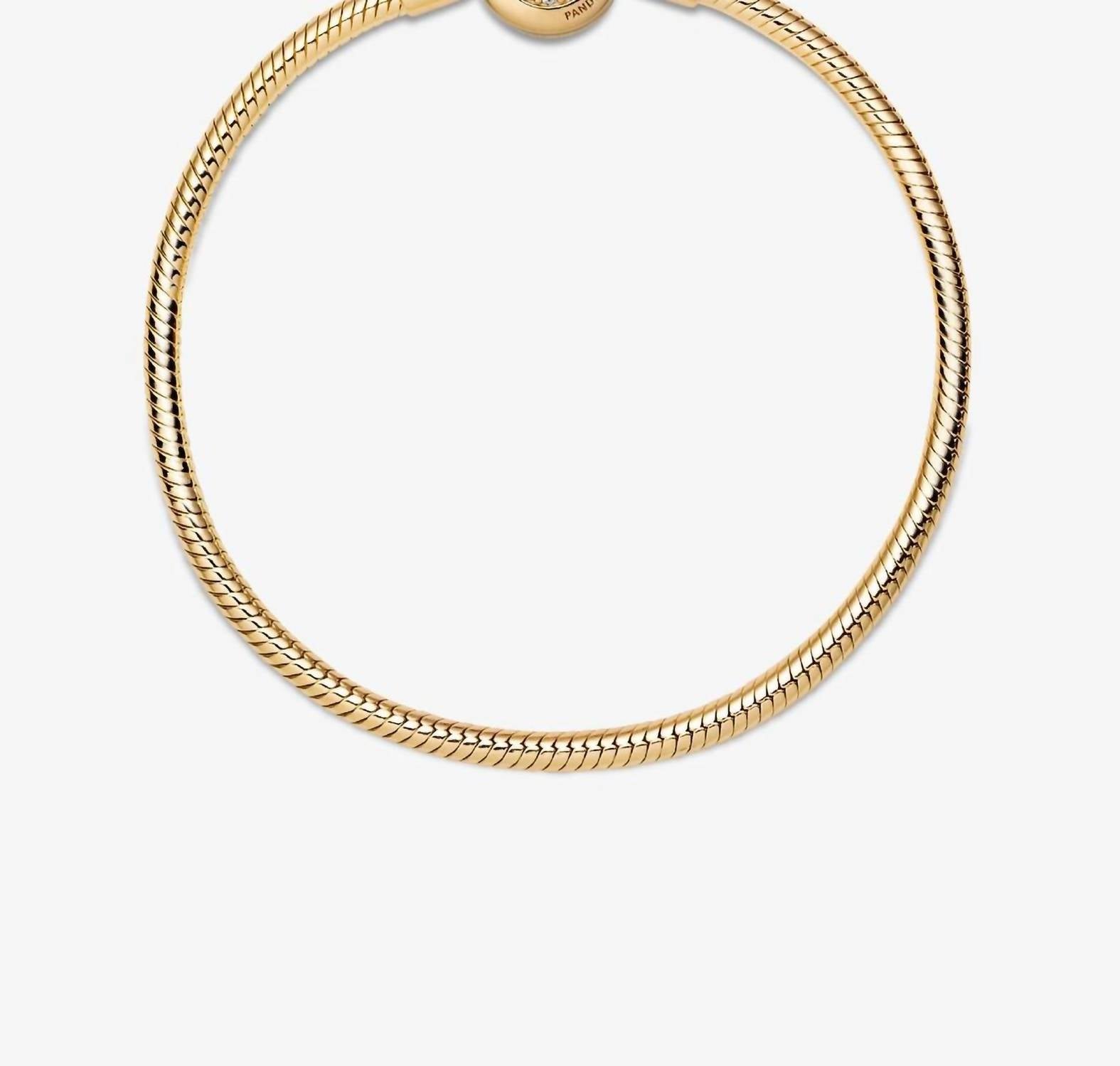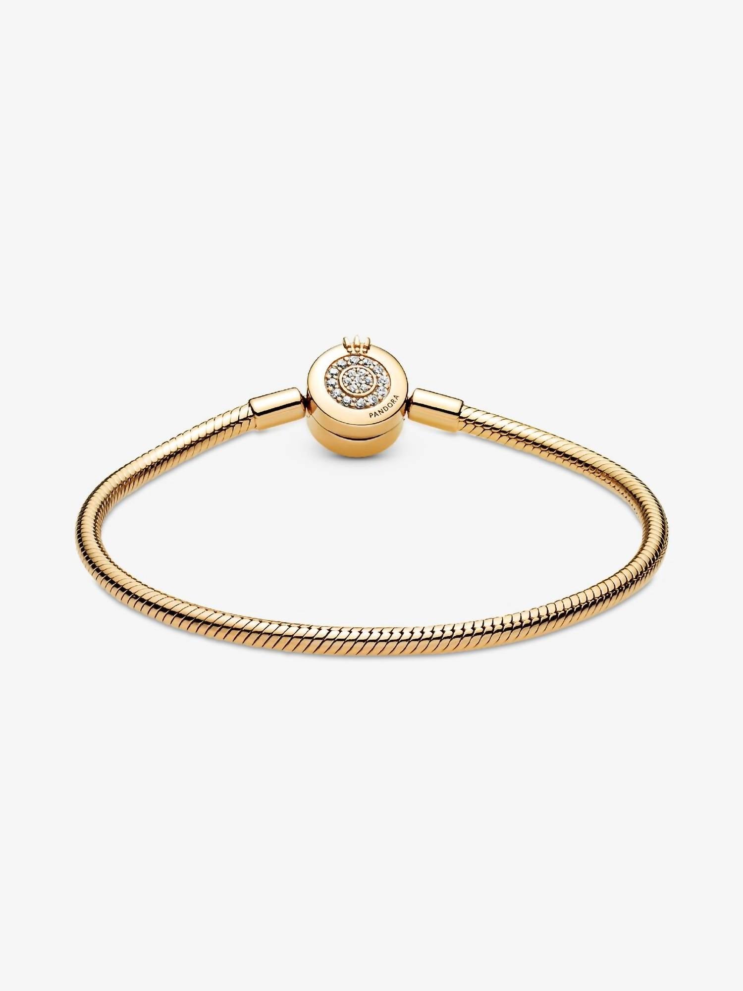 This stand-out bracelet is good enough to wear on its own, or stacked with your favorites. Presenting the Women's Sparkling Crown Bracelet by Pandora, a stunning piece with a chic 14k gold-plated snake chain. This bracelet features a dazzling cubic zirconia pavé clasp in the shape of the iconic Pandora O, perfect for making a sleek statement. Elevate your style by wearing it alone or pairing it with your favorite charms. Ideal for those who appreciate luxurious details in their fashion jewelry.