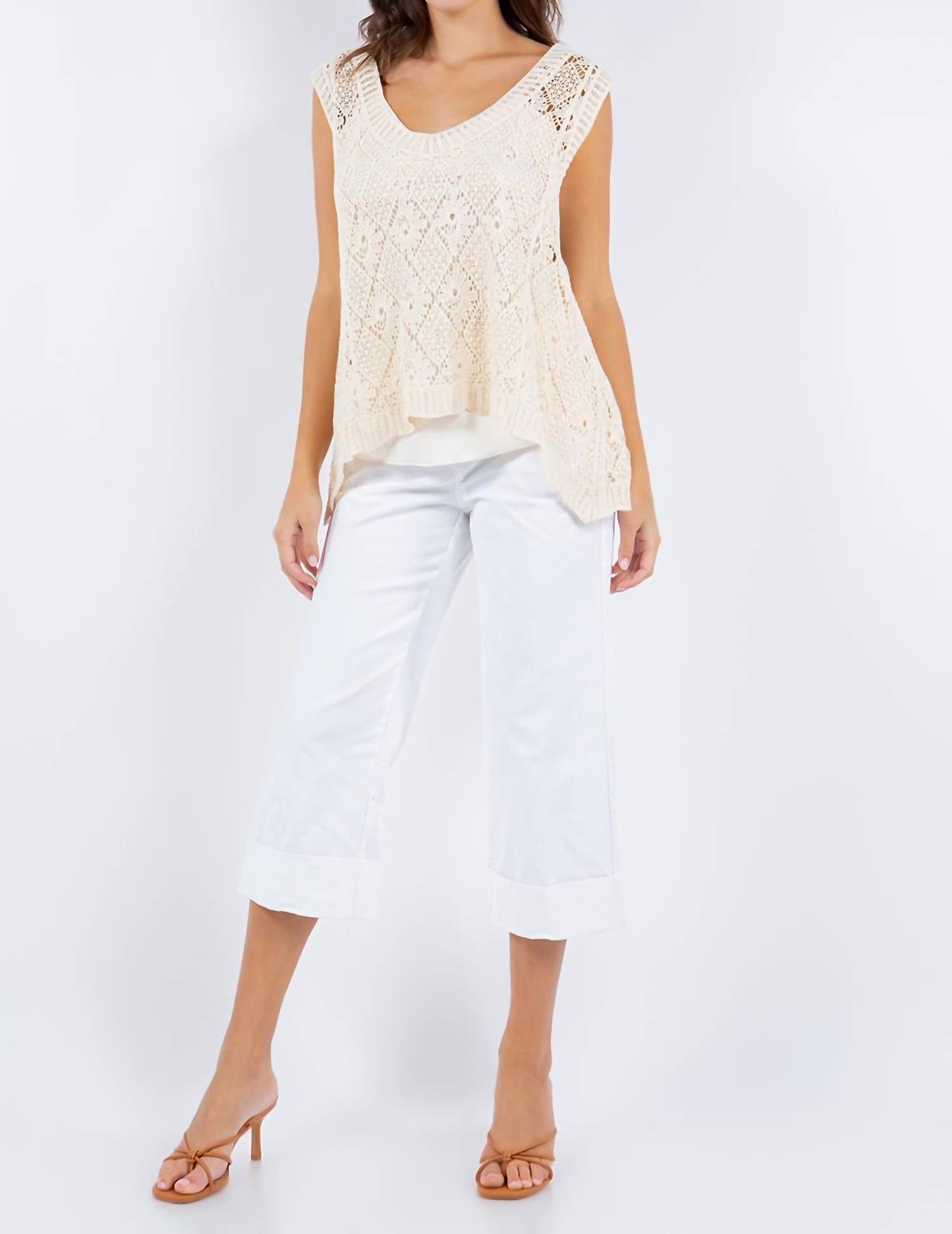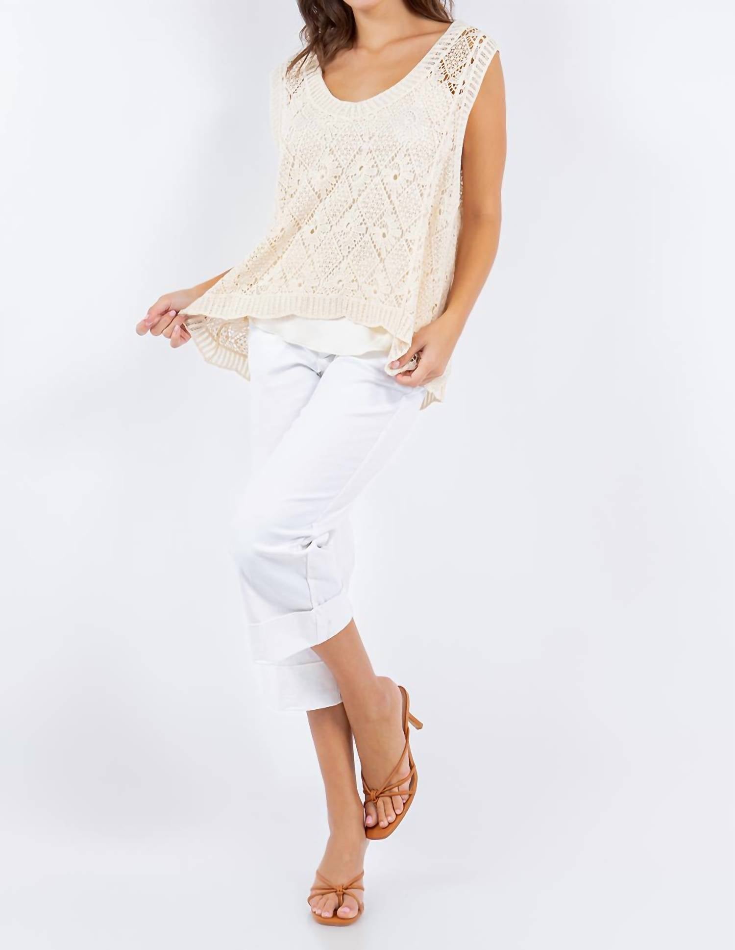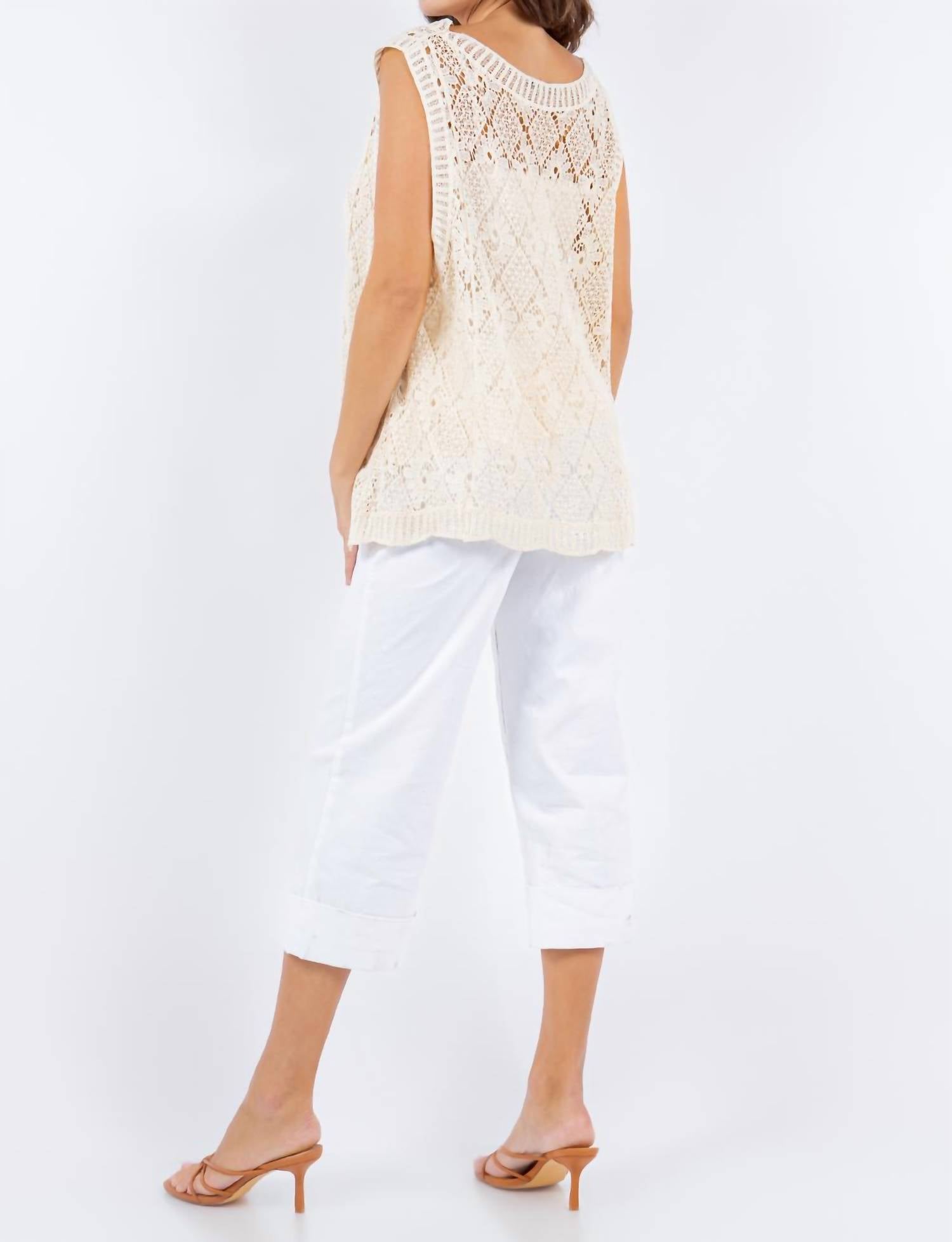 Esta regata clássica é perfeita para usar em camadas e é fofa o suficiente para ser usada sozinha. Apresentamos a Regata Crochê com Estampa de Diamantes Hi-Low da PAPARAZZI, criada para elevar o seu guarda-roupa de verão. Esta regata sem mangas possui decote redondo e mangas largas, perfeita para um dia de praia. Confeccionada em 100% algodão, ela apresenta uma estampa minimalista de diamantes com um elegante design hi-low e bainha recortada. Cuide dela lavando à mão e secando no varal, garantindo que ela continue sendo uma peça essencial versátil para ocasiões de clima quente.