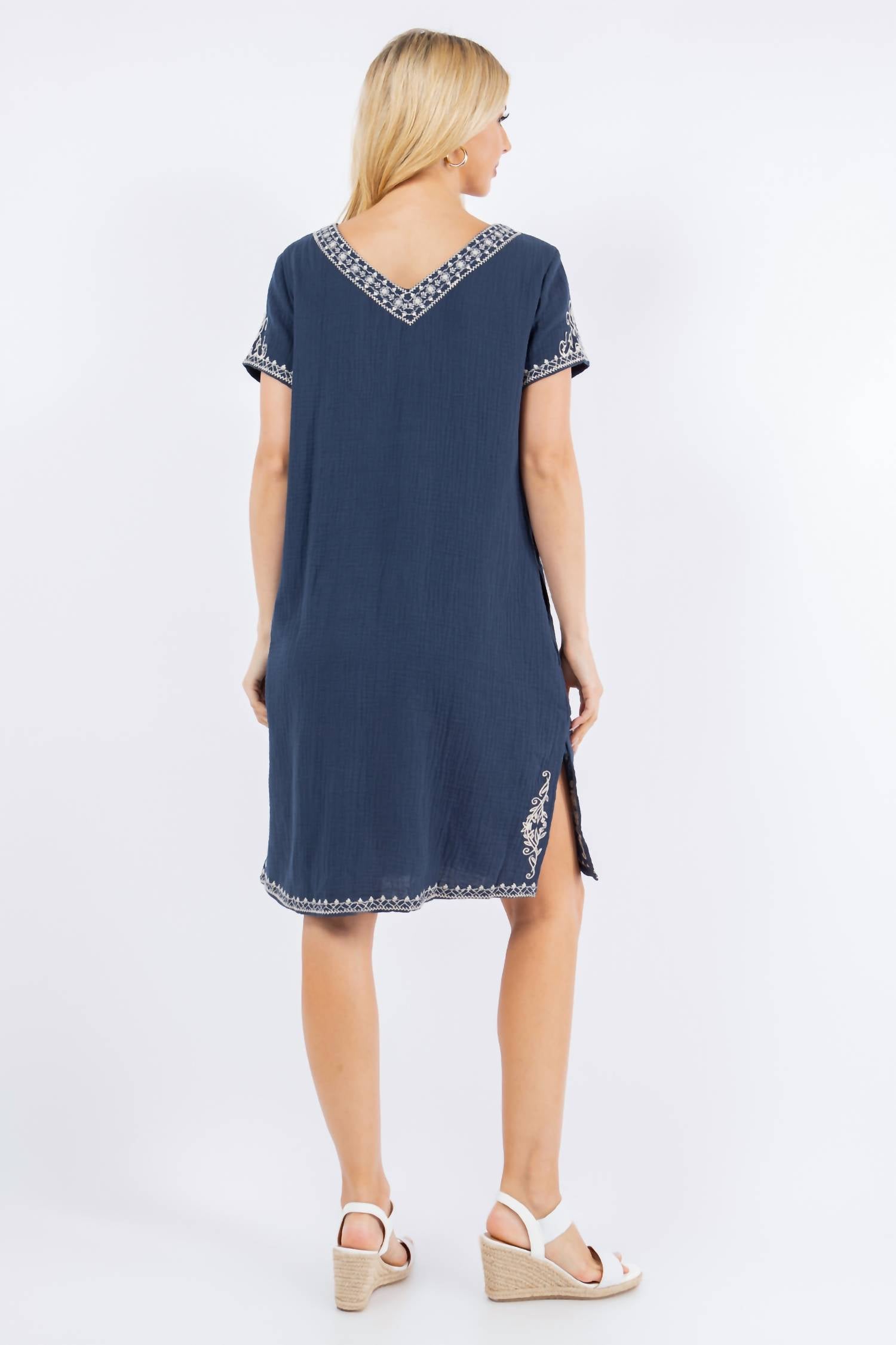 Um vestido curto e arejado para os dias mais quentes. Descubra a elegância sem esforço com o Vestido Paparazzi de Gaze Dupla Face Bordada em Azul-Marinho. Este minivestido apresenta um elegante decote em V duplo e mangas curtas, adornado com detalhes bordados em uma única cor e um acabamento com borlas para um toque especial. Feito em 100% algodão, garante conforto e estilo com bainha reta e fendas laterais. Cuide deste vestido lavando-o à máquina em ciclo delicado e secando-o em temperatura baixa.