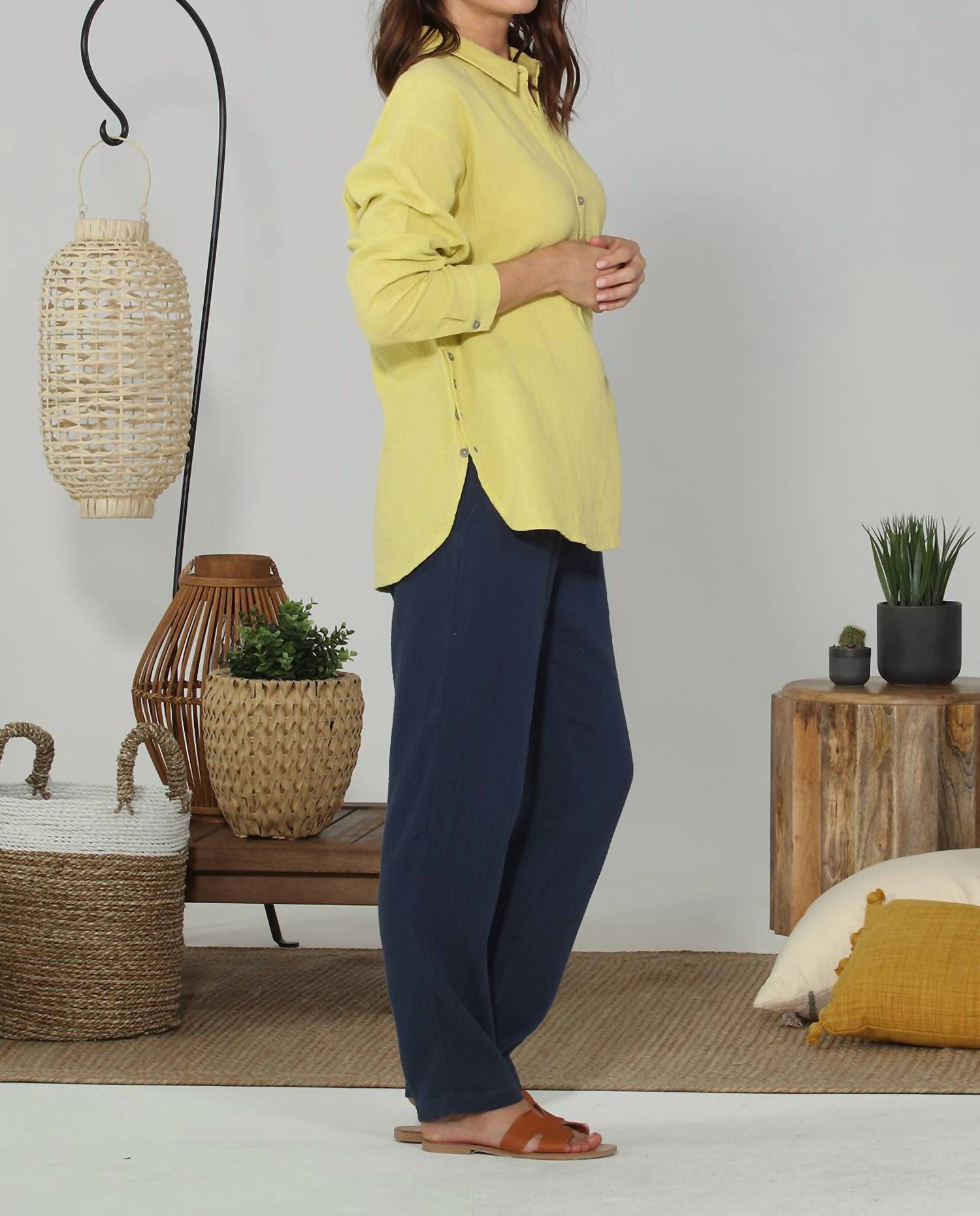 Uma blusa atemporal que nunca sai de moda. Eleve seu guarda-roupa minimalista com a Camisa de Manga Longa Double Gauze da PAPARAZZI em um tom limão vibrante. Confeccionada nos EUA em algodão macio, esta blusa lisa apresenta mangas longas com punhos abotoados e meio botão frontal, complementados por uma gola clássica. As laterais com botões e a bainha arredondada oferecem uma silhueta única sem bolsos, para um visual clean. Projetada com fecho de botão, esta peça é fácil de cuidar, seguindo as instruções de lavagem e secagem na máquina. 100% algodão.