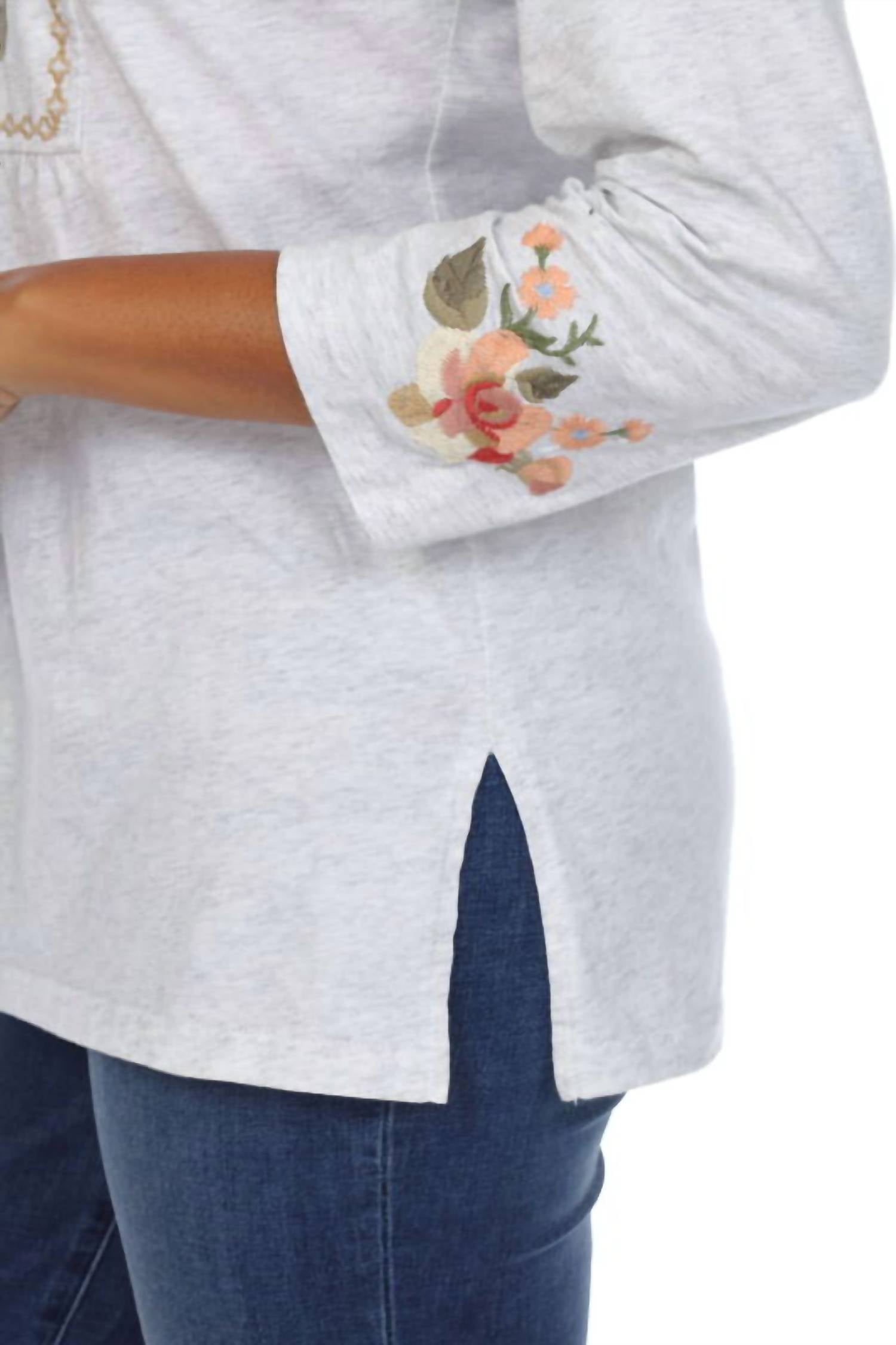 Caimento perfeito, design charmoso, tecido macio. Você vai adorar tudo nesta camiseta de manga comprida. Apresentamos a Camisa Pulôver de Malha Bordada da PAPARAZZI, uma combinação perfeita de conforto e estilo em cinza clássico. Com mangas três quartos, decote em V com amarração e um corpete e detalhe de manga bordados florais multicoloridos exclusivos. Confeccionada em 100% algodão, garante respirabilidade e praticidade com fecho pull-on. As instruções de cuidado incluem lavagem à máquina com água fria em ciclo delicado, sem alvejante e secagem em temperatura baixa.