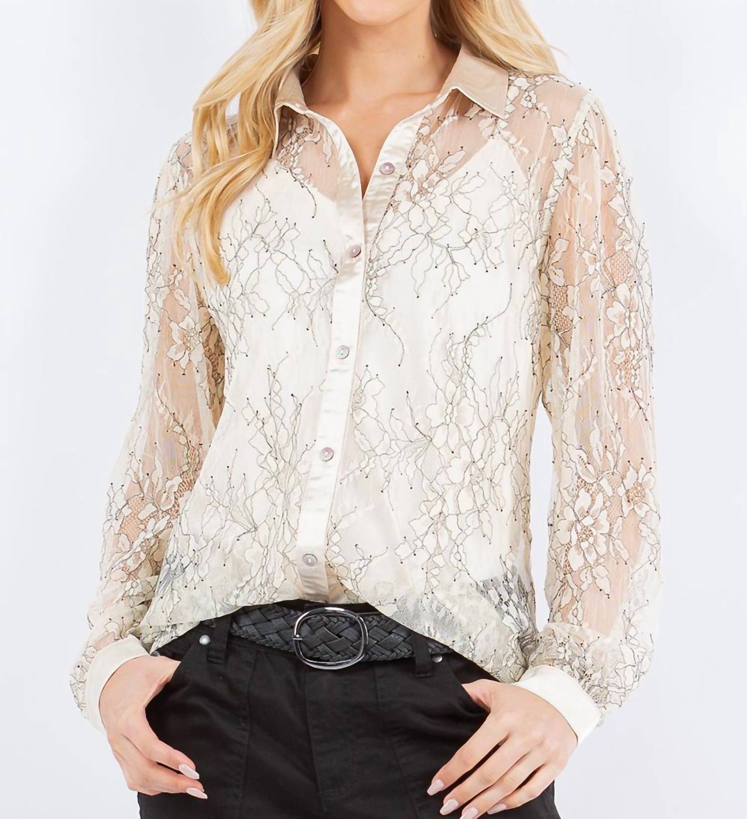 Uma camisa clássica de botões que nunca sai de moda. Camisa de renda, renda floral contrastante, frente inteira com botões e gola, manga comprida com punho abotoado, gola, carcela e punhos com acabamento em cetim, bainha arredondada. Sem forro.