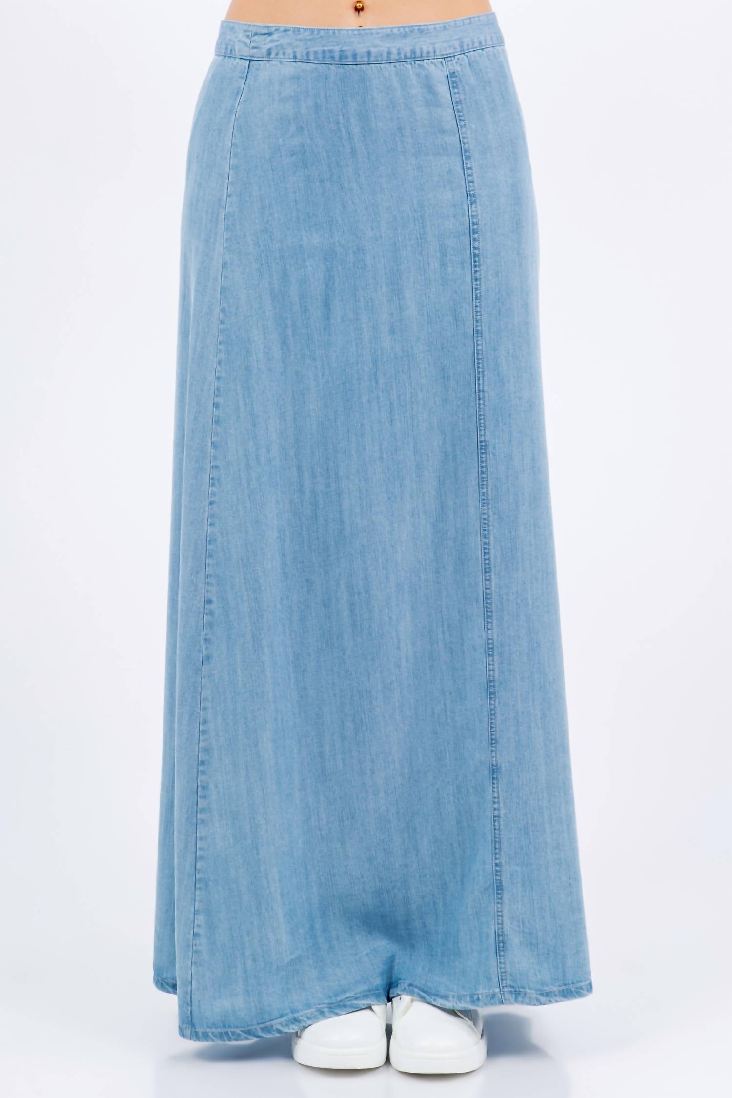 Vista sua camiseta favorita para um visual mais casual, porém feminino. Eleve seu guarda-roupa com a Saia Longa Jeans Tencel da PAPARAZZI, uma peça chique e despojada com lavagem leve. Esta saia com estampa lisa apresenta cintura marcada e bainha reta aberta, atingindo 94 cm de comprimento. Confeccionada em 100% Tencel, oferece um caimento contemporâneo que se mantém fiel ao tamanho, com fechamento por um prático zíper lateral. As instruções de cuidado incluem lavagem à máquina com água fria, sem alvejante e secagem em temperatura baixa.