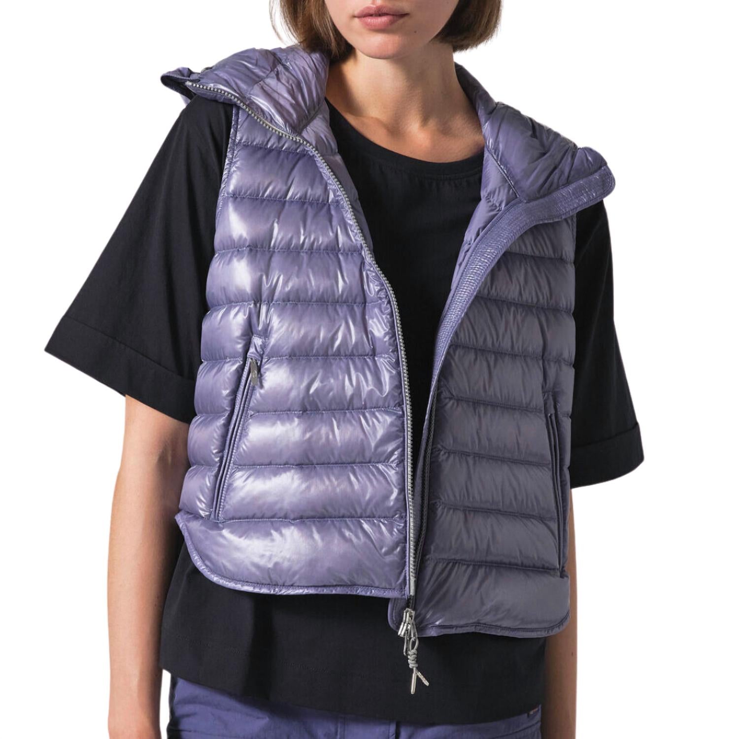 Use este colete sobre uma roupa toda preta para um visual perfeitamente elegante. Paraquedistas Karissa Nylon Tafetá, Penas e Penugem em Hipnose Colete Puffer Capuz ajustável com cordão Fechamento frontal com zíper duplo deslizante Dois bolsos com zíper Patch de logotipo no capuz Tratamento repelente de água Tecido respirável Tecido à prova de vento Poder de preenchimento 700 Fiel ao tamanho