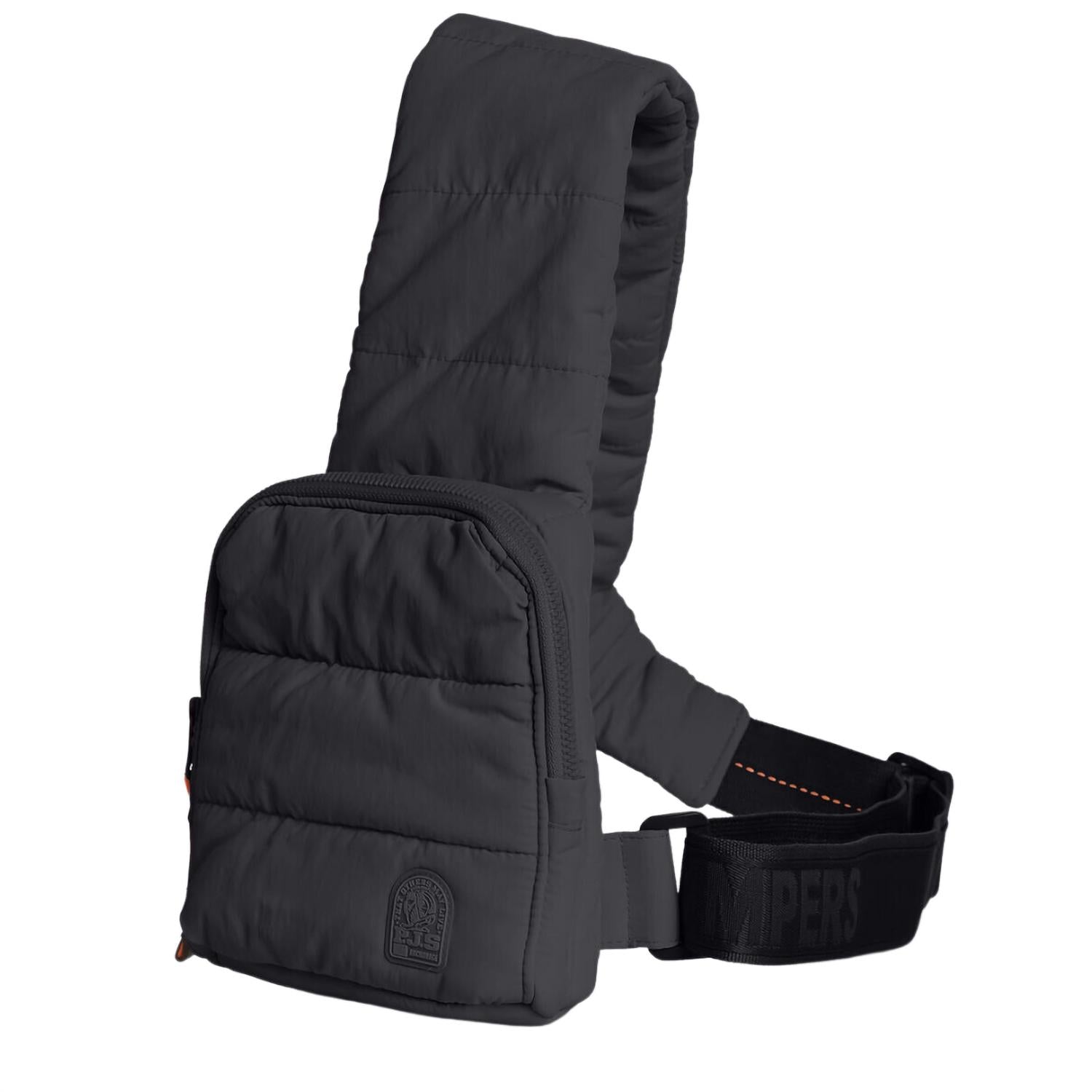 Esta bolsa transversal será sua bolsa preferida da estação. Paraquedistas Jaqueta bomber de um ombro só Nylon repelente de água em preto Bolsa transversal Fechamento com zíper Alça de ombro ajustável com marca Detalhe do remendo de borracha Acabamento fosco do corpo principal Forro à prova de plumas