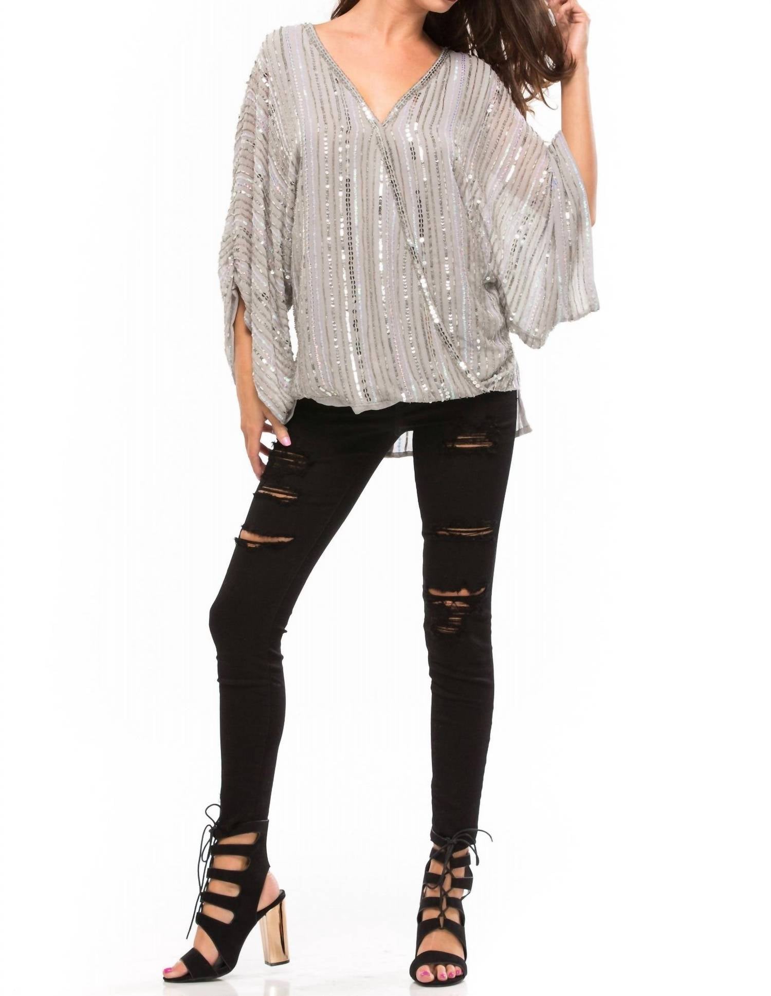 Unveiling the Parker Bayside Sequin Top, a stunning piece that combines beading and iridescent sequins for a show-stopping effect. This long sleeve blouse features a V-neckline and a surplice front, creating an oversized and relaxed silhouette that is partially lined. Made from 100% Silk, it offers effortless elegance with a pull on closure. Care instructions include dry cleaning to maintain its exquisite appearance.