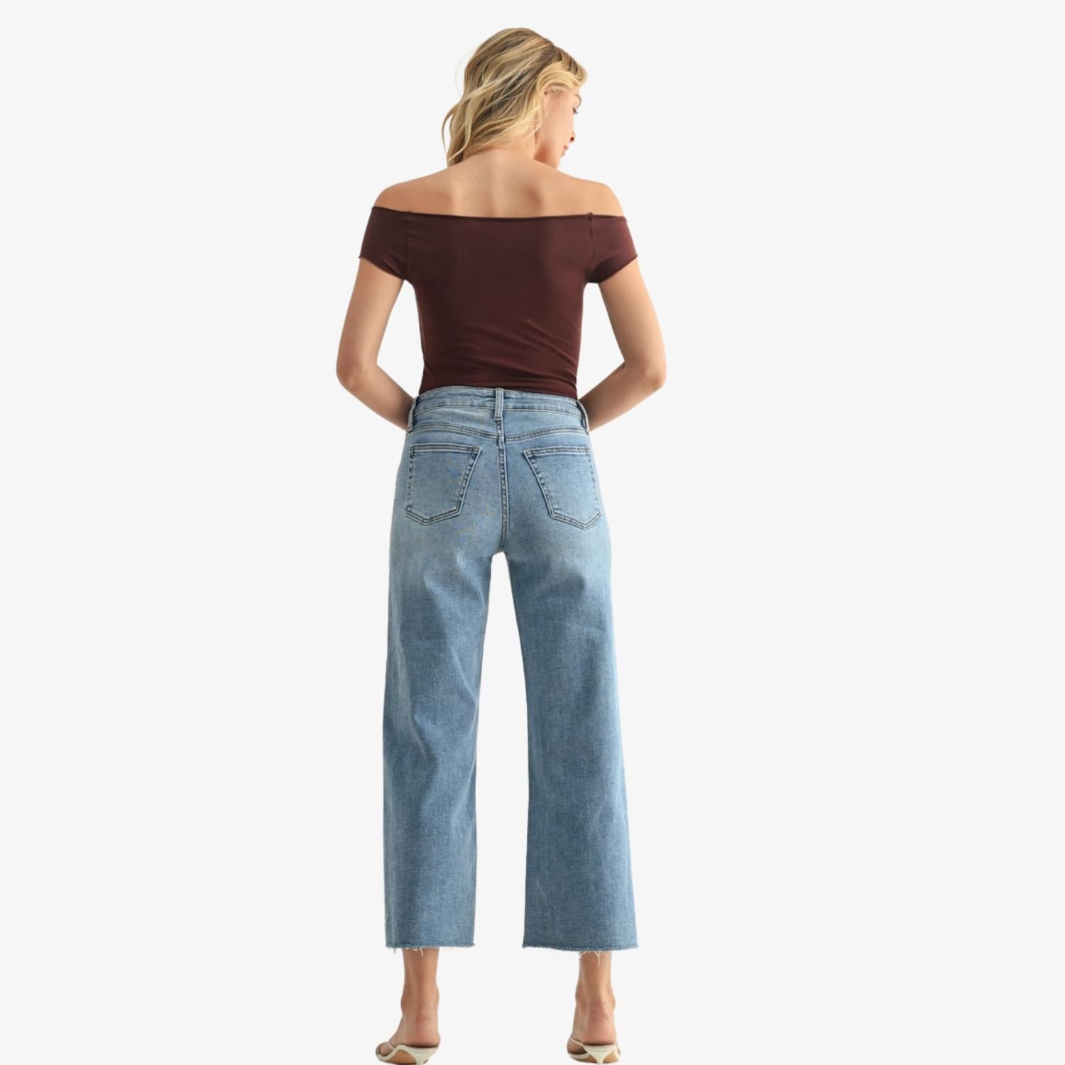 Introducing the Parker High Rise Wide Leg Jean, a versatile piece in blue designed for modern style with a touch of nostalgia. These jeans feature a flattering high-rise waist with zip and button closure, and are fitted through the hips with a soft wide-leg silhouette. Made from 99% cotton and 1% spandex, the medium-wash denim boasts a cropped length with a raw-edge hem for a chic, casual look. Perfect for dressing up or down, these jeans suit any occasion from spring outings to special anniversary celebrations. Care: Machine wash and tumble dry.
