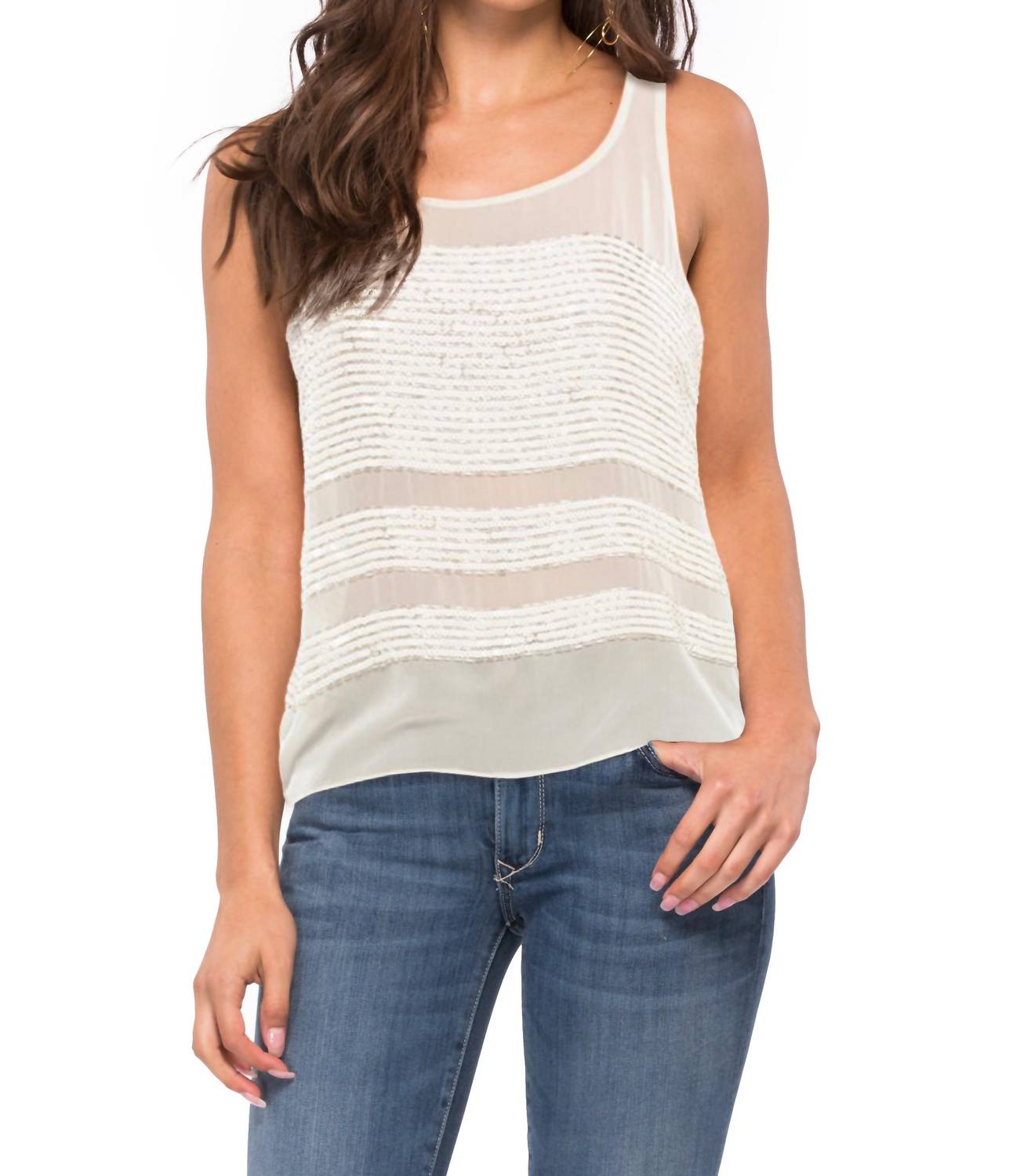 The Naples Sequin Tank Top by Parker is a striking sleeveless design featuring a sophisticated ivory hue and a captivating stripe pattern. Crafted from polyester, this scoopneck top boasts thick triple rows of sequin beading for a touch of glamour. Emphasizing ease and comfort, the pull-on closure makes it perfect for summer vacation outings, aligning seamlessly with the trendy Y2K aesthetic. Care is simple with hand wash instructions recommended for maintaining its exquisite allure.