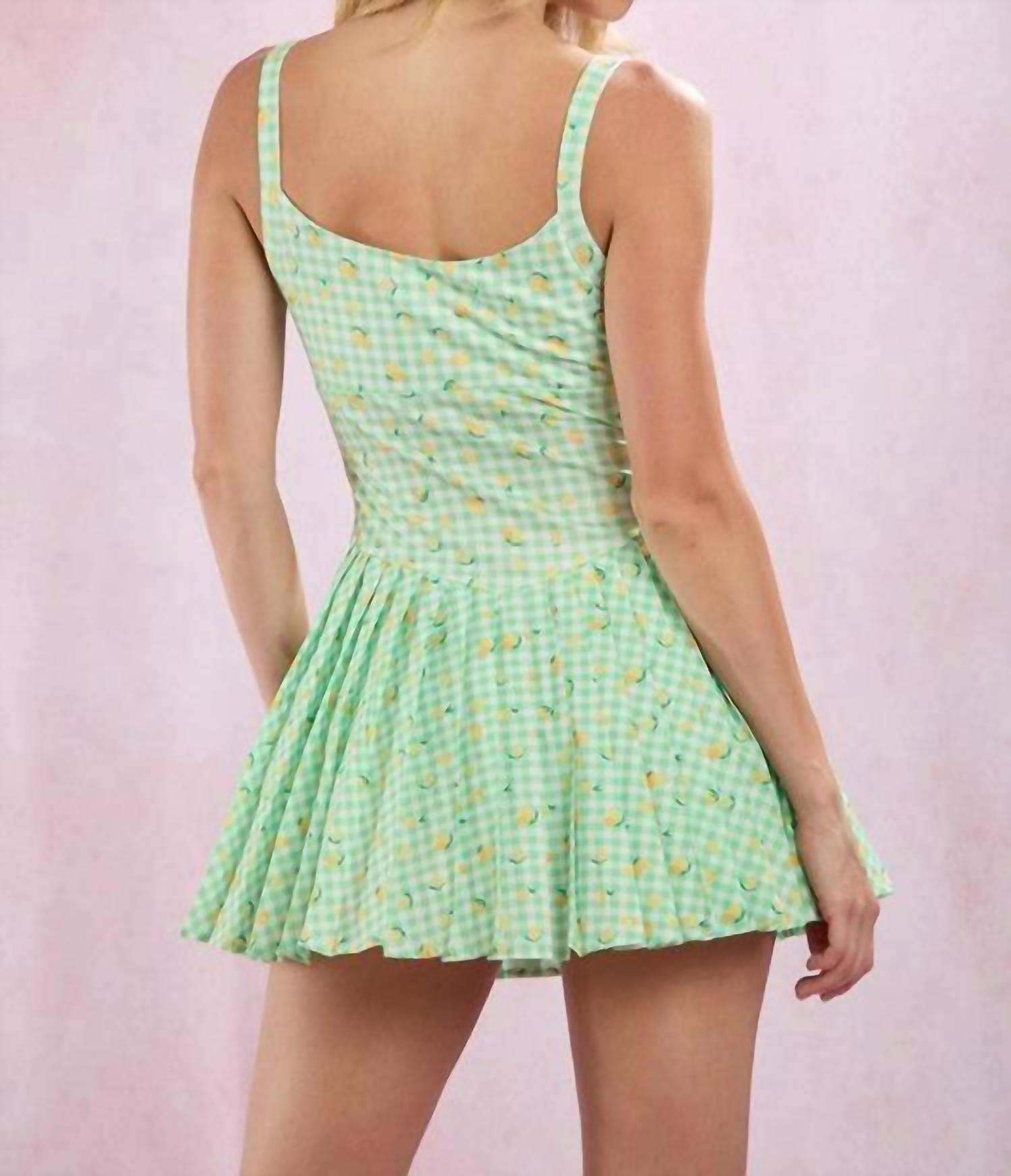 Introducing the Gingham Lemon Sporty Romper by Peach Love, a playful addition to your summer wardrobe in vibrant green. This sleeveless romper features a scoop neckline and adjustable spaghetti straps for a comfortable fit. Crafted from polyester, it includes a stylish A-line silhouette with a pleated skirt over shorts, and a solid lemon print. Suitable for vacation outings and trendy vintage looks.