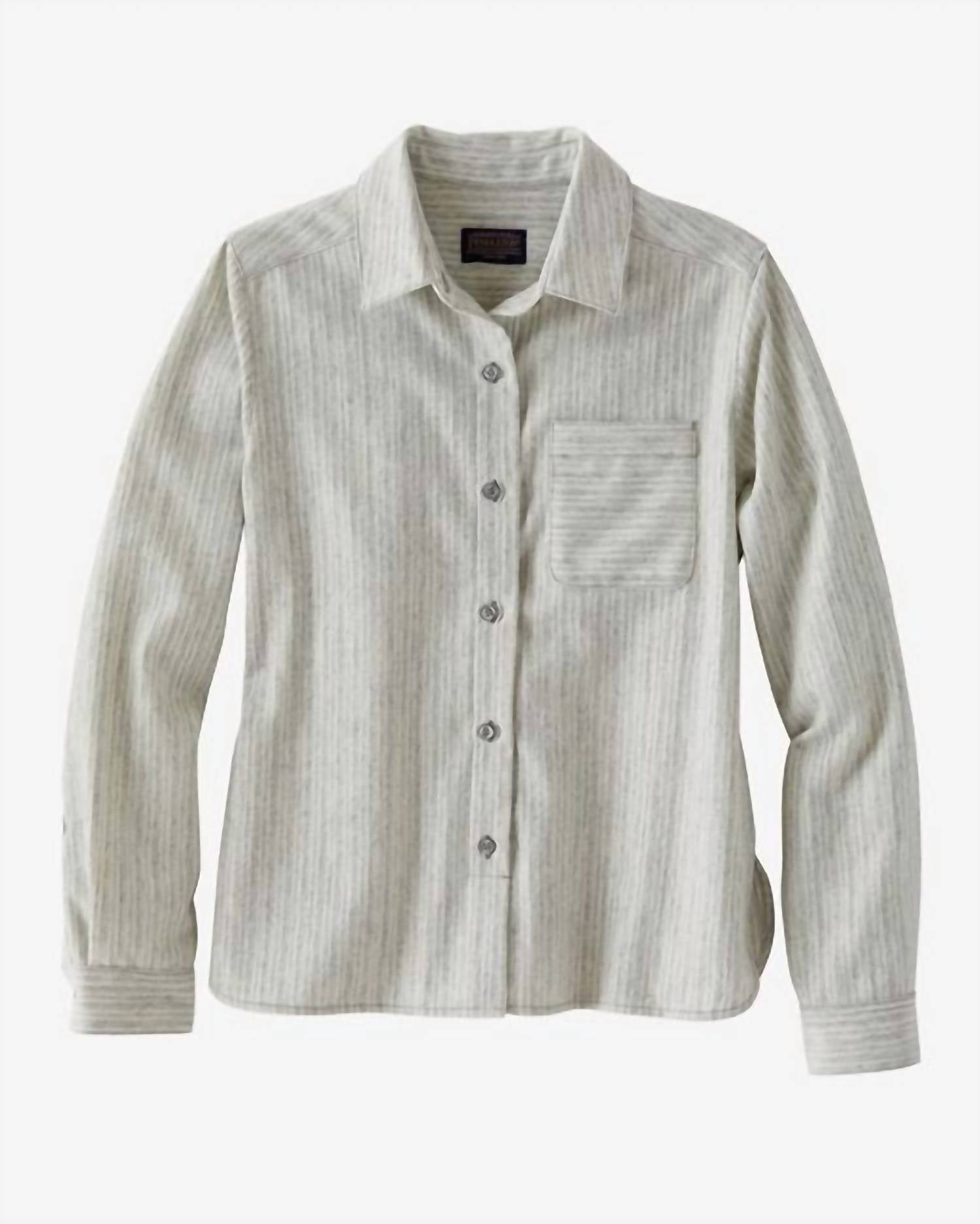 Discover the Cropped Lodge Shirt by Pendleton, a stylish piece for women that showcases long sleeves and a crisp collar in a chic grey mix stripes pattern. Made from 100% Virgin Wool, this jacket offers breathability, durability, and a stain-resistant finish. Measuring at 25 inches in length, it features a convenient button closure, a chest pocket, and curved sides. Crafted from imported materials, it is easy to care for with machine wash instructions.