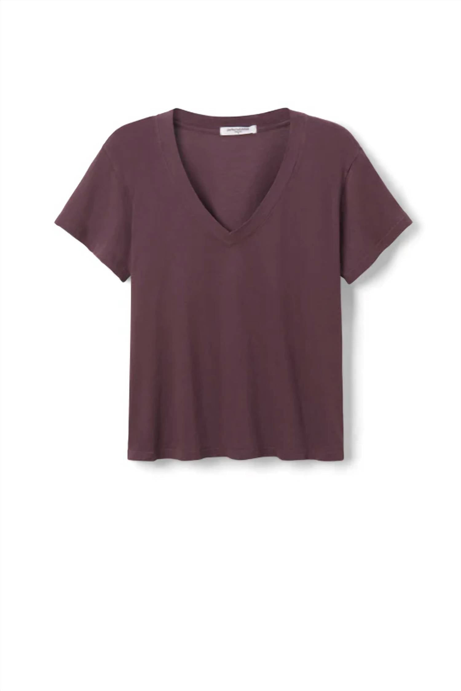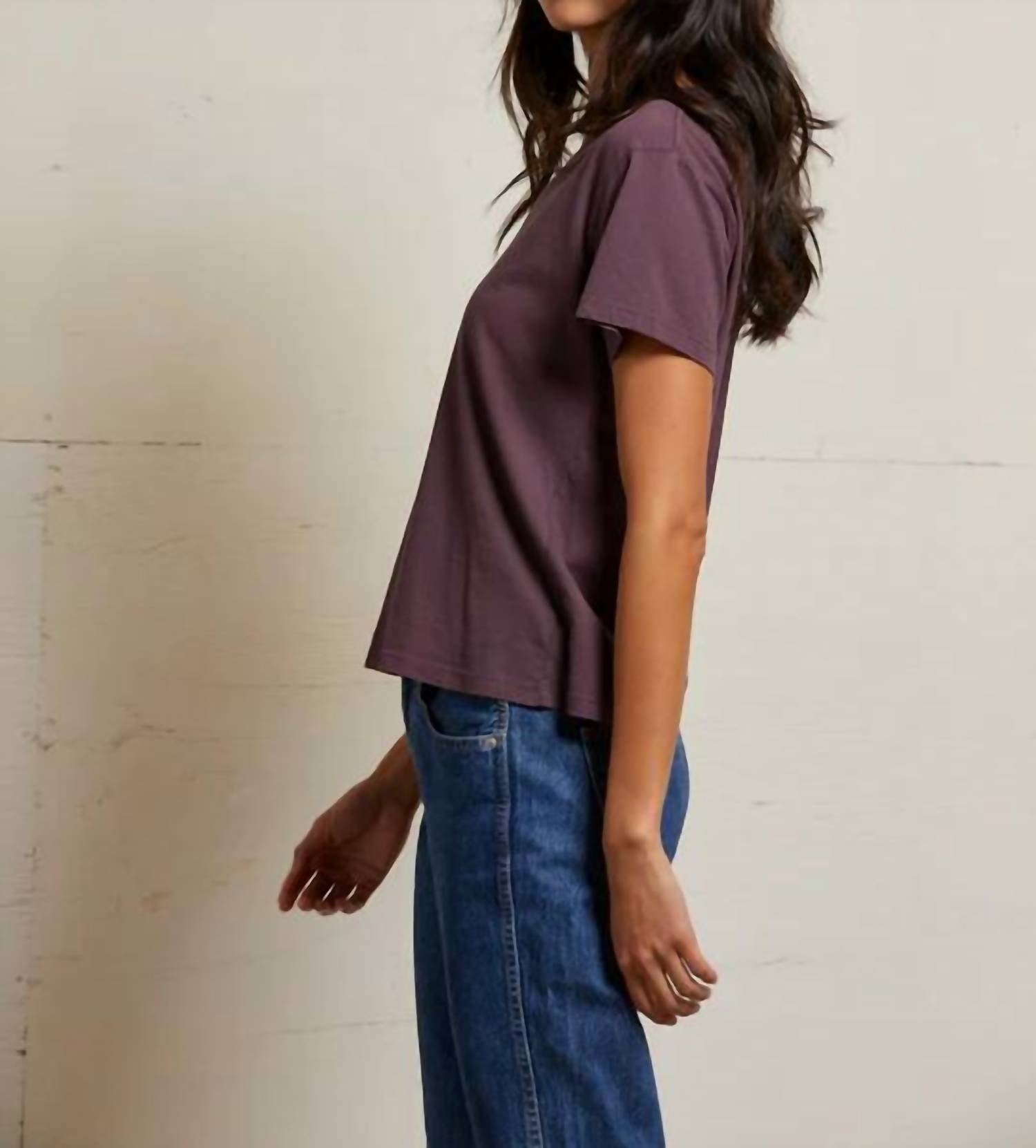Experience the effortless comfort. Season-less essential in a rich plum hue. Designed with short sleeves. 100% crisp cotton. Slightly oversized, sexy-yet-subtle V-neck that flatters any figure. Hits just below mid-rise denim, making it a perfect staple for any wardrobe. Pull on closure. Care instructions include a gentle machine wash in cold water, tumble dry low, and avoid bleaching or adding softener; a warm iron can be used if needed.