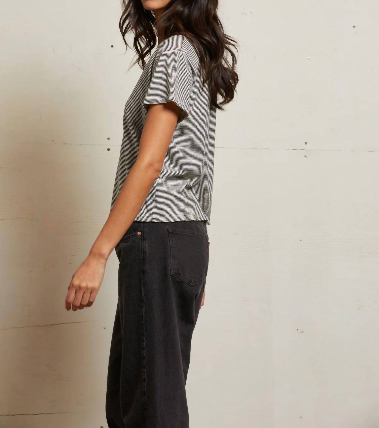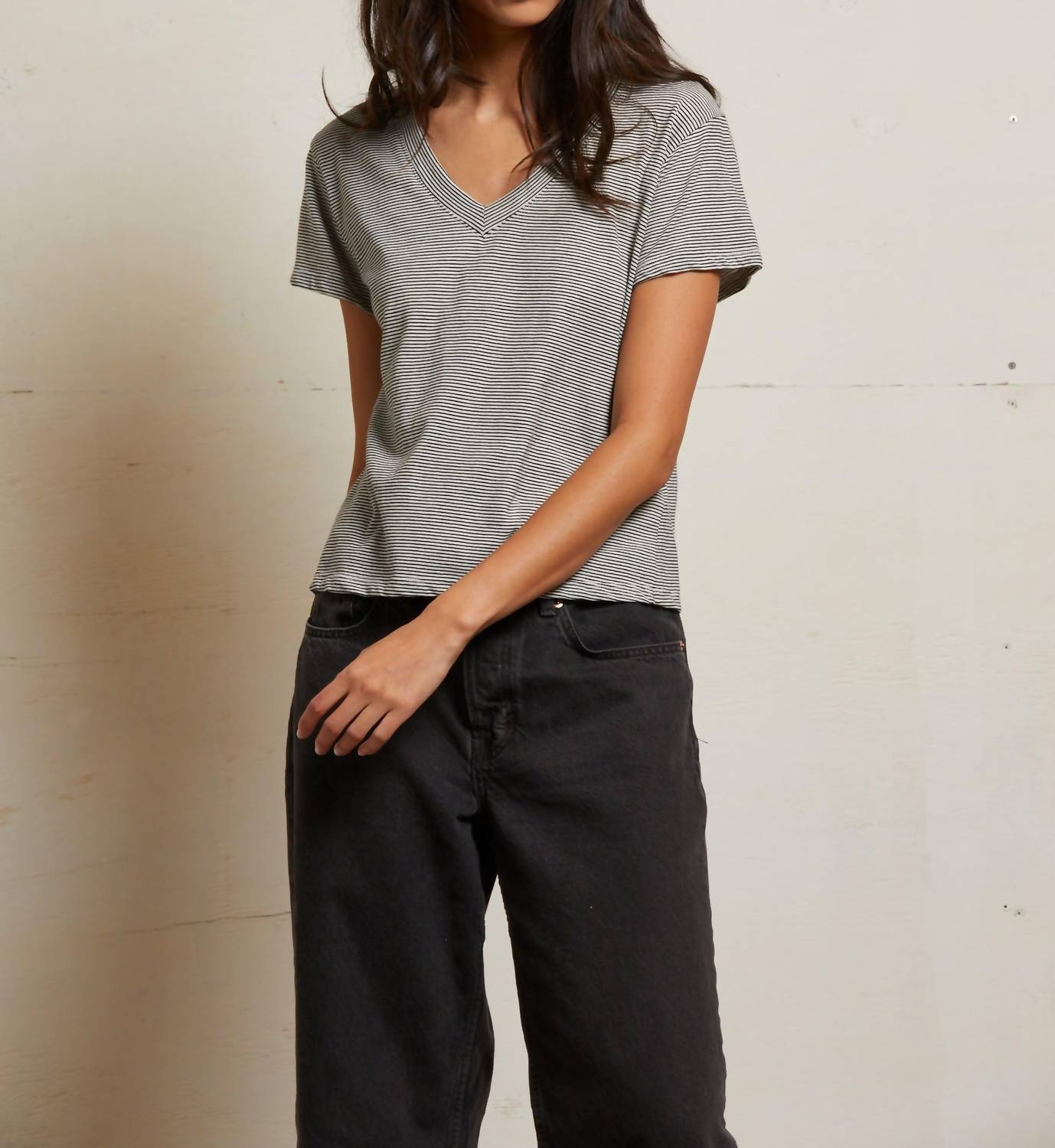 Experience ultimate comfort with the Hendrix V-neck Tee by perfectwhitetee, crafted in a chic Ivory Black stripe pattern. This short sleeve, slightly-oversized tee is made from crispy lightweight 100% cotton fabric milled in the US. It features a casual pull-on closure, making it an effortless choice for everyday wear. Care is simple with machine wash cold, tumble dry low, and a warm iron if needed.