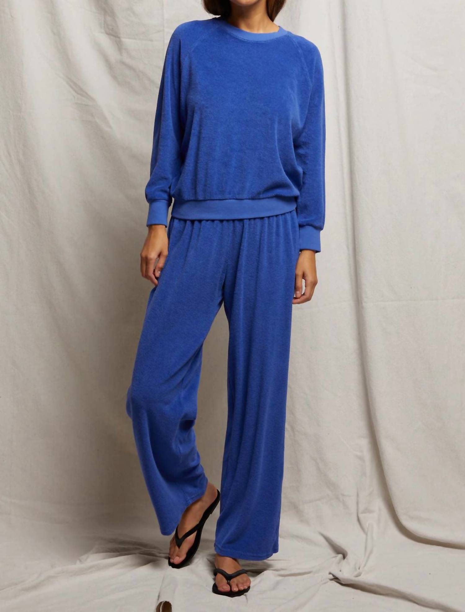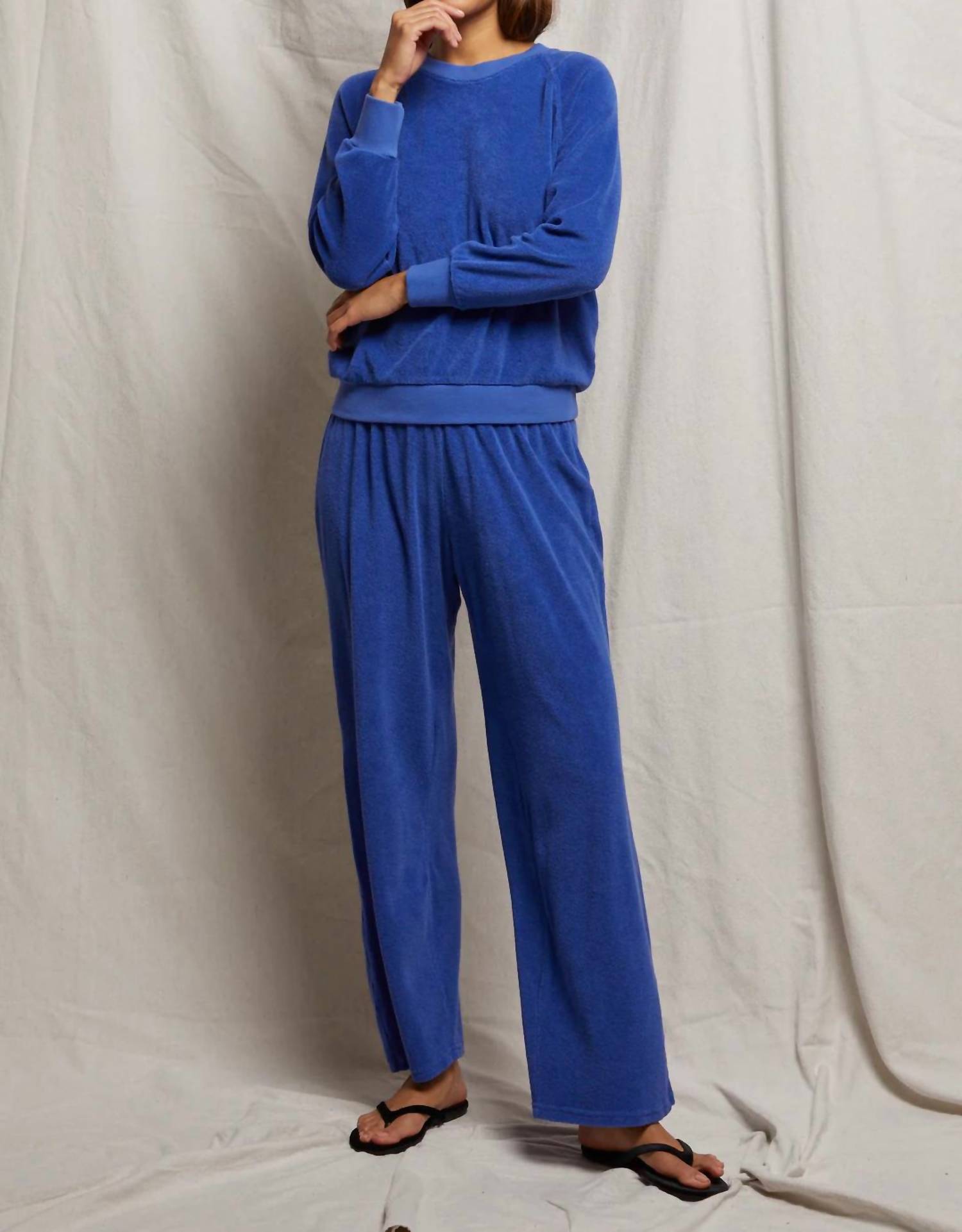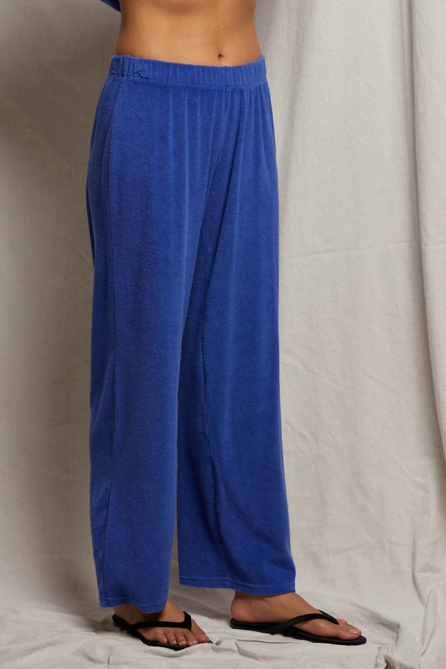 A perfectly tailored straight leg that you'll want in every color! Introducing the Katie Terry Pants by perfectwhitetee, a throwback to 90s fashion with their straight leg and relaxed fit design. Crafted from 100% premium loop terry cotton, these violet blue pants offer a decadent texture perfect for spring. Originating from California, they feature a convenient pull-on closure and high-rise waist for added comfort. Care is simple: machine wash cold, tumble dry low, and avoid spot treating for best results.