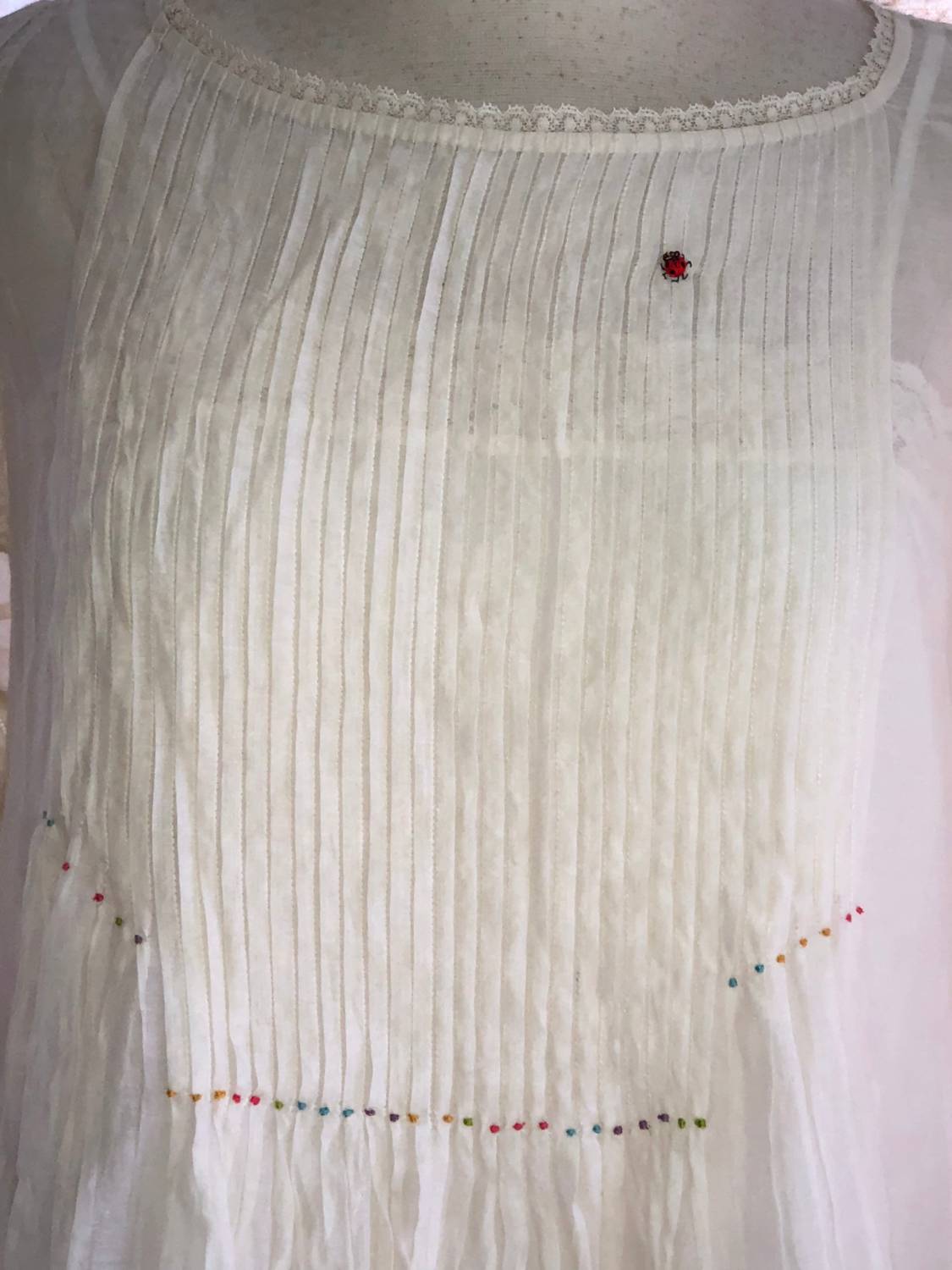 A midi dress so versatile, your options for wearing it are endless. Presenting the Women's Cotton And Silk Dress by Péro, a harmonious blend of tradition and style. This elegant off-white midi dress features three-quarter sleeves and a crewneck, enhanced with pleating detailed by a rainbow hue of hand-sewn threads. Crafted from a luxurious composition of 50% cotton and 50% silk, the dress embraces a solid pattern with a pull-on closure for seamless wear. Made in India, care for this garment by hand washing, ensuring it retains its exquisite handmade quality.
