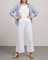 Introducing the Aria Cropped Pant by Phoebe Jon, a chic addition to your summer wardrobe in solid white. Crafted in an easy cotton blend, these pants feature cropped wide legs with a leg opening of 12.5 inches, a high-rise design with an 11-inch rise, and a versatile button closure with additional hook and eye fastenings. Thoughtfully designed with two side and faux back pockets, they fit slim at the waist and thigh while easing into a flare below the knee. Composition: 96% Cotton, 4% Spandex. Care: Machine wash on delicate and line dry, or opt for dry cleaning.