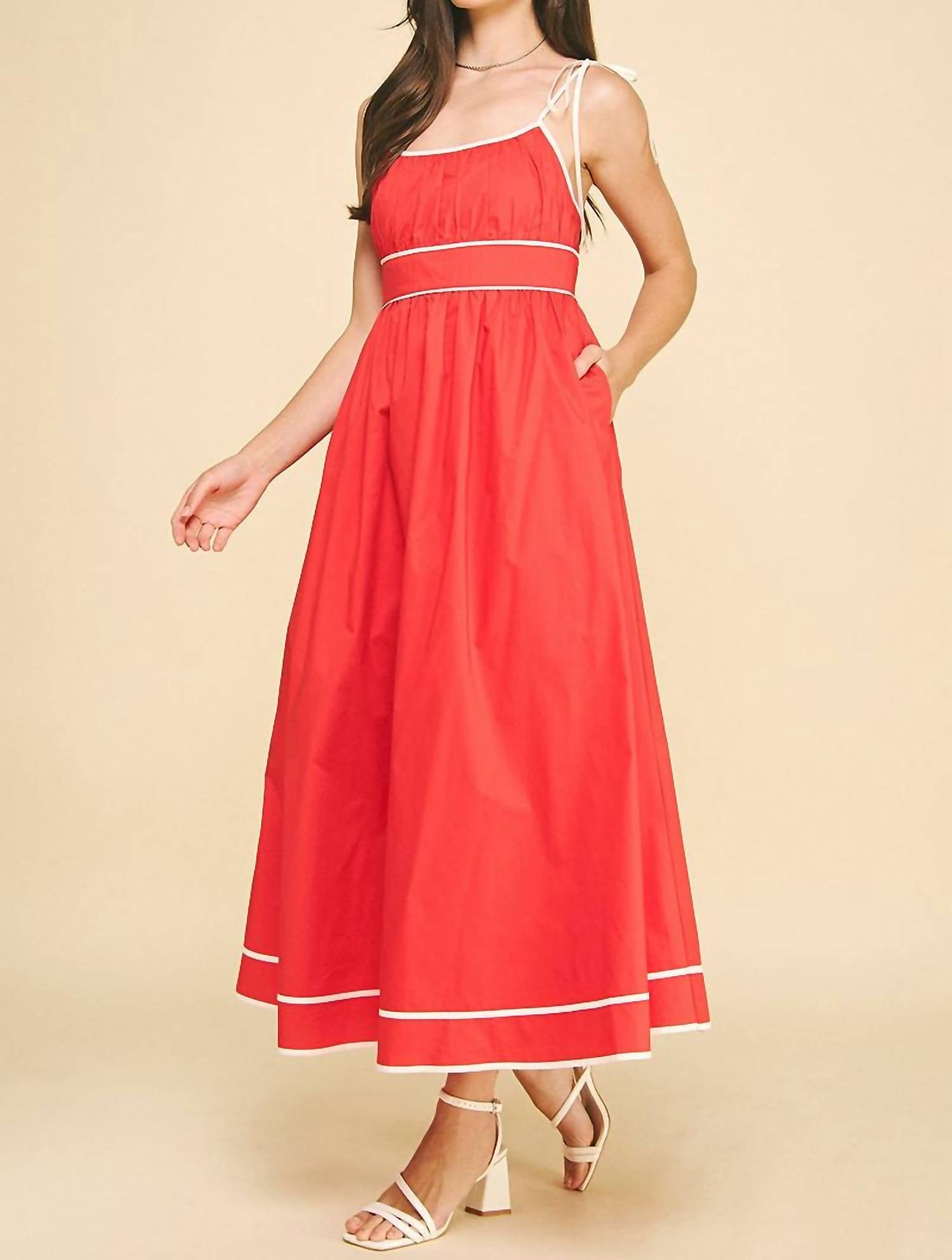 Style this maxi with your favorite statement necklace and sandals for the perfect look. Introducing the Marlie Sporty Dress by PINCH, a chic choice in Warm Red perfect for Autumns and Springs. Designed with adjustable tie spaghetti straps and a flattering scoopneck, this A-line maxi dress is crafted from 100% Cotton with a Polyester lining. Featuring a convenient zipper closure along the back, it offers practical elegance with pockets and a length of 52 inches. Care for this solid silhouette with a simple hand wash. Bust sizes available: (S) 29", (M) 31", (L) 33"; Length: (S) 52", (M) 53", (L) 54".