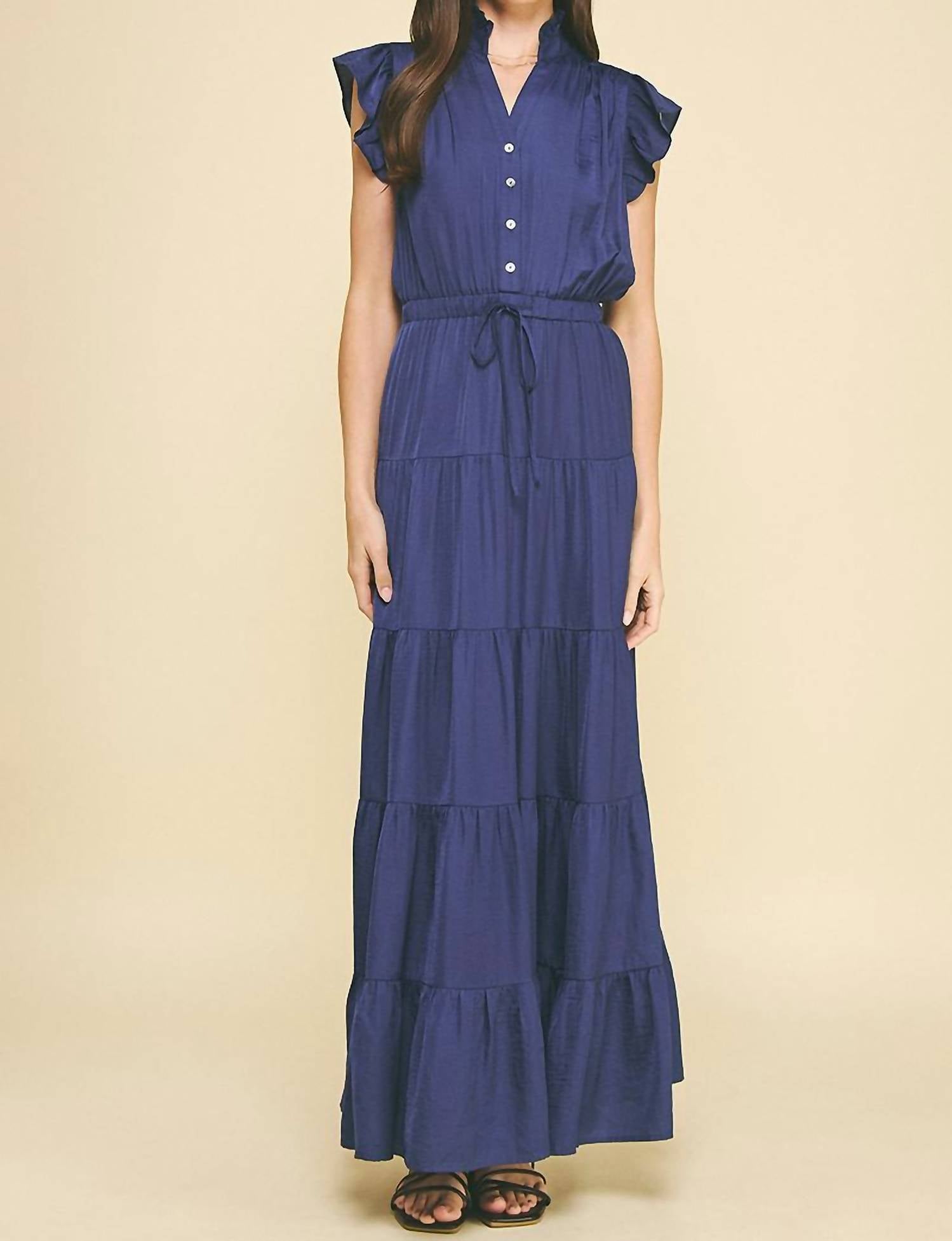 Style this maxi with your favorite statement necklace and sandals for the perfect look. The Penelope Tiered Maxi Dress by PINCH is a stunning choice for women who adore minimalist fashion with a touch of elegance. Crafted with bright navy polyester, this A-line dress features cap flutter sleeves and a flattering cinched tie waist. The maxi length offers a graceful silhouette, and the dress closes with buttons for a neat finish. Care: Hand wash. Available in sizes with a bust of (S) 40", (M) 42", (L) 44" and lengths of (S) 55", (M) 56", (L) 57".