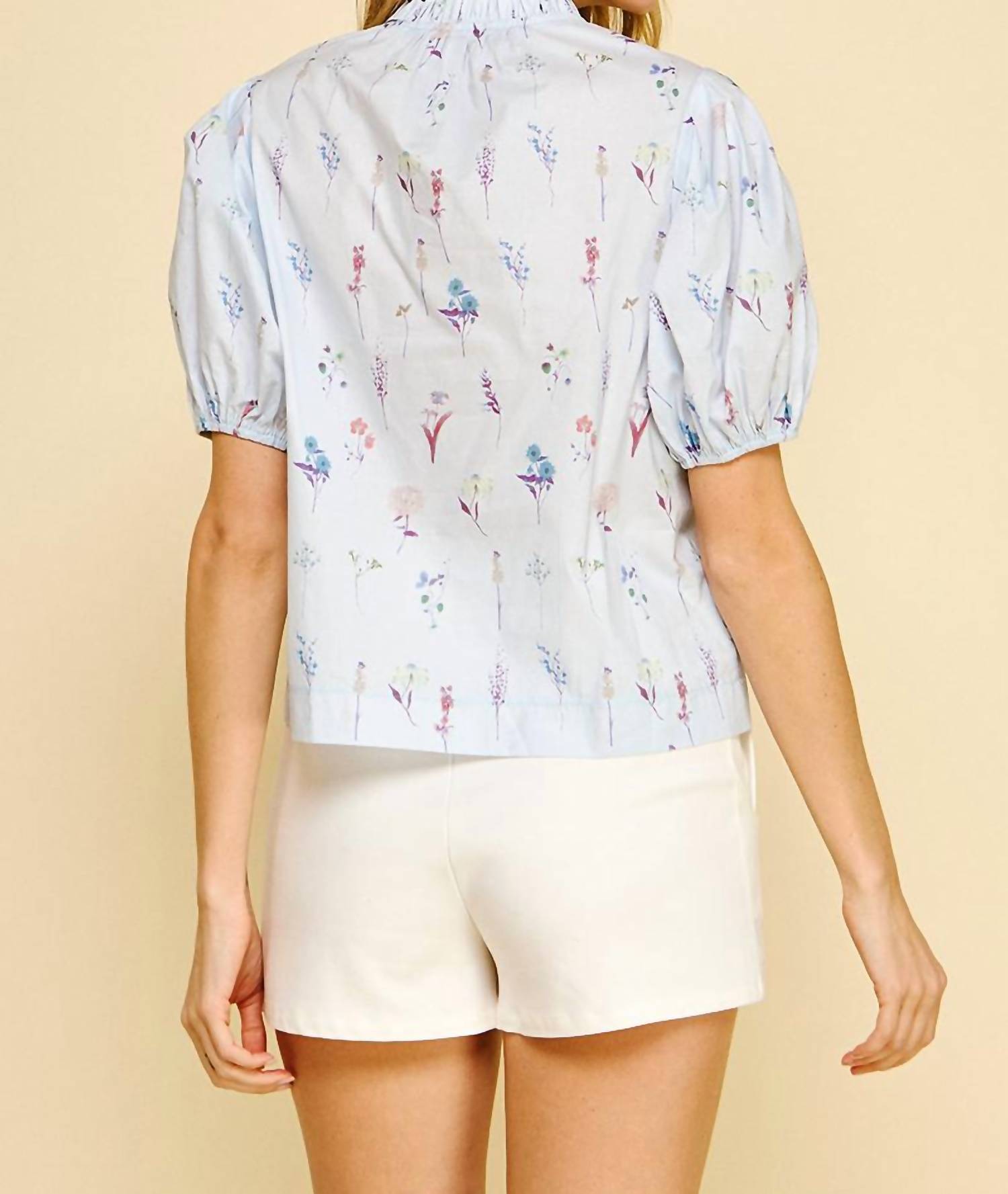 A timeless blouse that will never go out of style. The Tally Puff Sleeve Top by PINCH is a charming addition to your spring wardrobe. Crafted from 100% cotton, this blouse features puffed short sleeves and a stylish V-neck, complemented by a ruffled mock neck that adds a touch of elegance. In delightful Powder Blue Floral, it pairs beautifully with a variety of looks, making it perfect for Easter or birthday celebrations. With a length of 22.5 inches for size S and bust measurement options of S (42"), M (44"), and L (46"), this top is comfortable and versatile. Care: Hand wash as instructed to maintain its boho chic appeal.