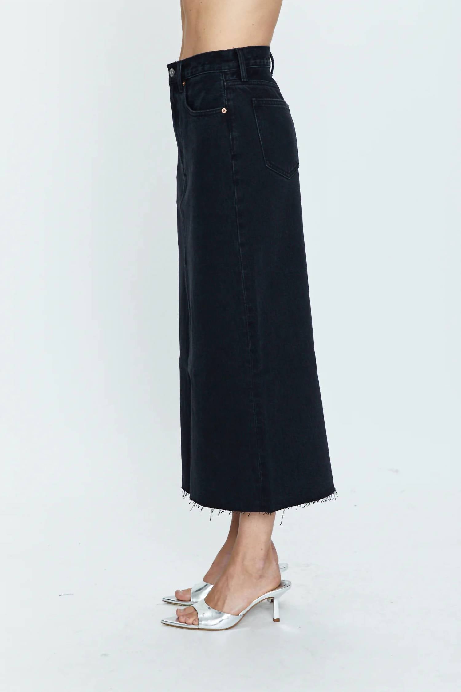 Discover the Alice Midi Skirt by Pistola, a sleek addition to your wardrobe in an Underground black wash. This women's skirt is crafted from classic cotton denim for a solid, polished look, complete with functional pockets and a stylish front slit that allows for ease of movement. Measuring 34.5 inches in length, it features a convenient zip closure. Care for it with machine washing, maintaining its contemporary charm. Model is 5'9" wearing size 26.