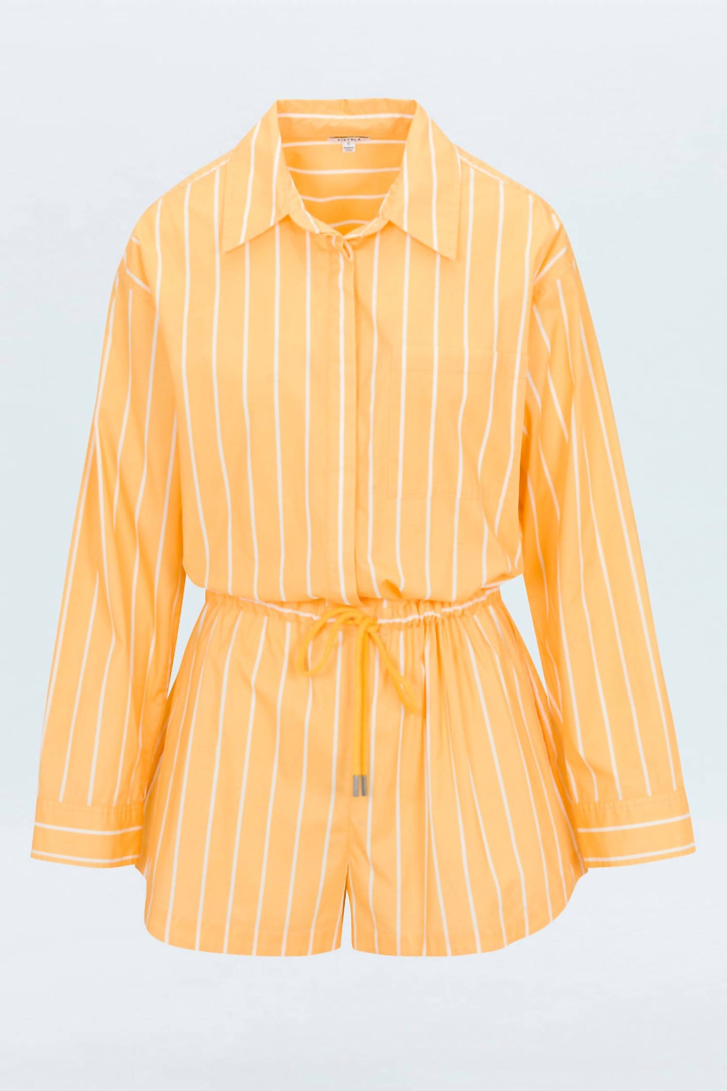 Meet the Amelie Long Sleeve Romper by PISTOLA, a perfect blend of style and comfort for your summer adventures. Crafted from a lightweight cotton blend, it features a collared, button-up bodice and a relaxed short silhouette. Its bright Papaya Stripe pattern adds a pop of color, while the adjustable drawstring waist ensures a flattering fit. Care is easy with machine wash instructions, making it ideal for travel and boho chic trends.