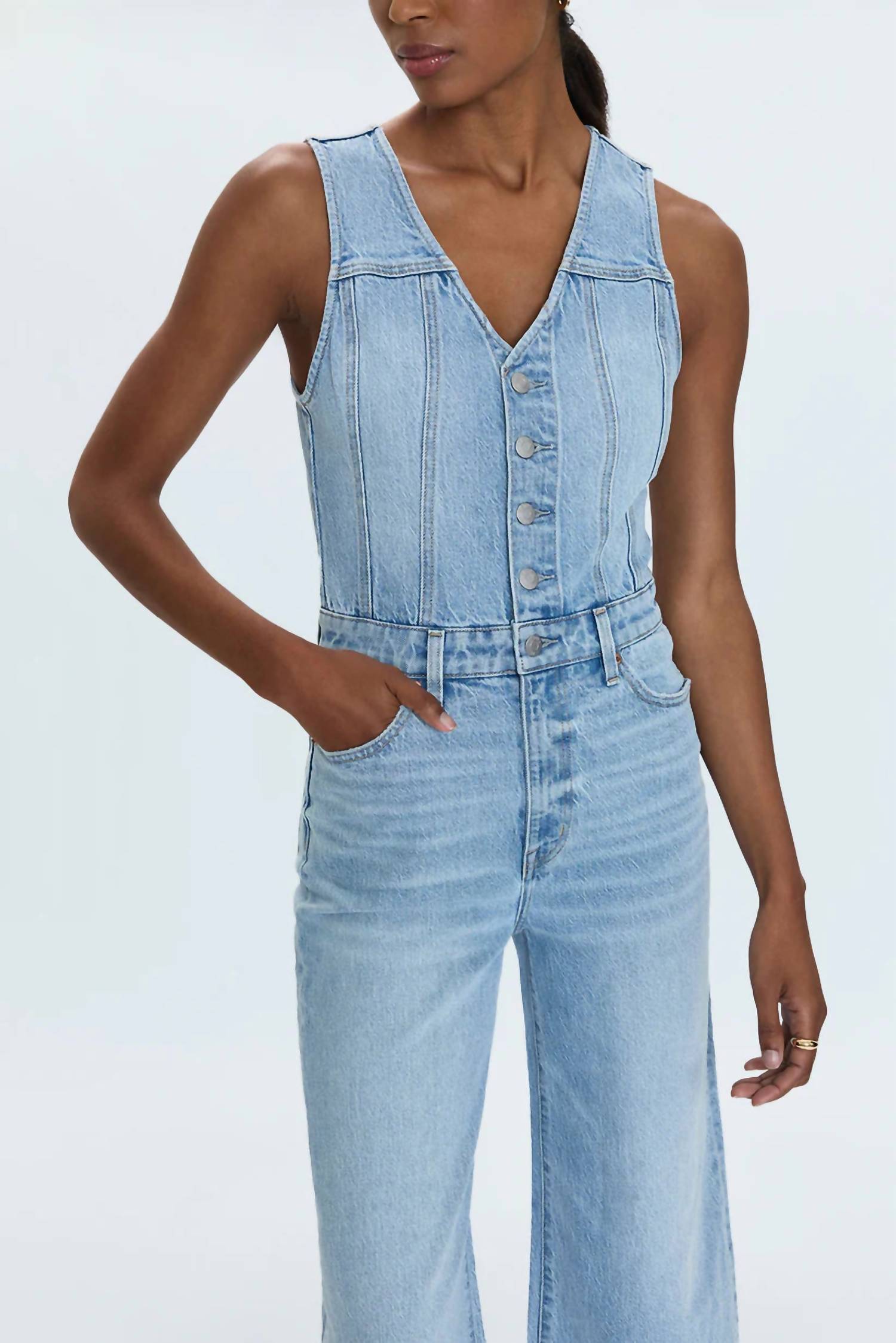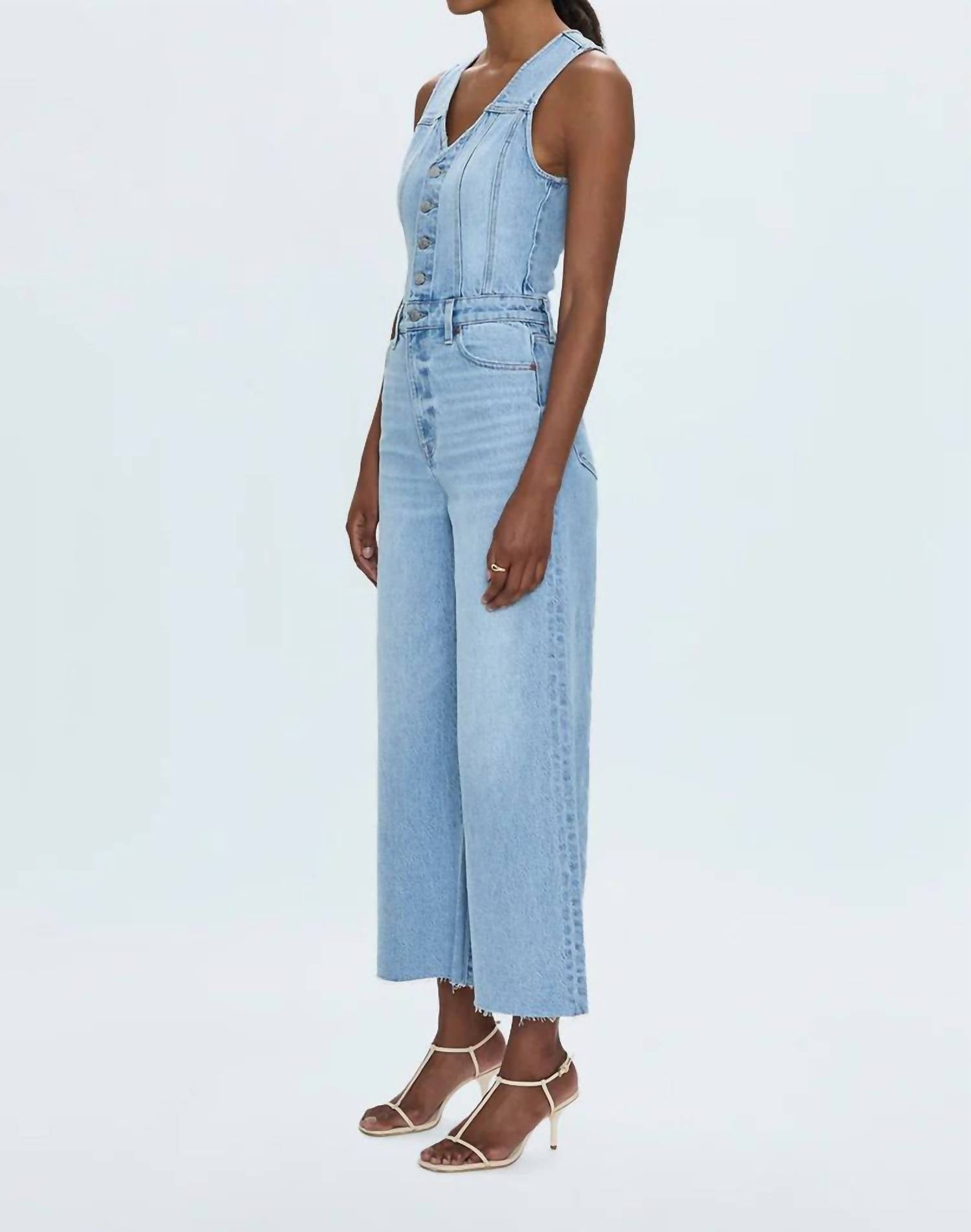 Step into the perfect blend of style and comfort with the Aria Cropped Fitted Vest Jumpsuit by PISTOLA. This sleeveless, textured piece in a priority colorway is composed of 77% Cotton, 22% Tencel, and 1% Spandex, ensuring a flattering fit. It features a 27" inseam and a 24" leg opening, thoughtfully designed to enhance your silhouette. Closure: Button closure. Care: Machine wash cold. This jumpsuit is crafted to transition effortlessly from casual to chic for any summer occasion.