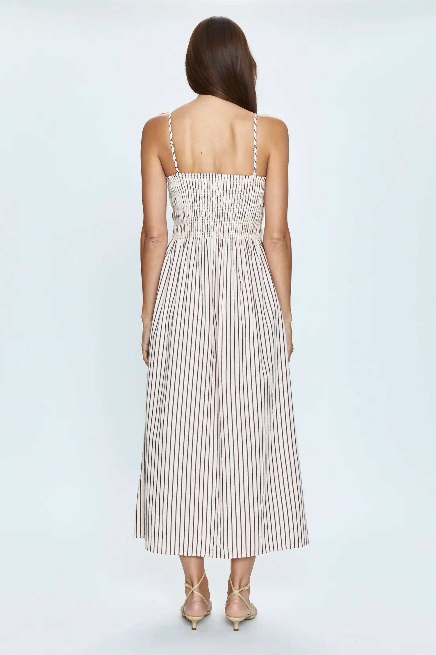 Apresentamos o Vestido Bianca com Corpete Smocked da PISTOLA, a sua escolha ideal para a elegância nos dias quentes. Este vestido midi com um delicioso padrão de listras tiramisu é confeccionado em uma mistura leve de algodão e possui alças finas ajustáveis para um ajuste perfeito. Com corpete franzido e detalhes franzidos, oferece estilo e conforto. Fácil de vestir. Recomenda-se lavar à mão e secar no varal. 97% algodão / 3% elastano.