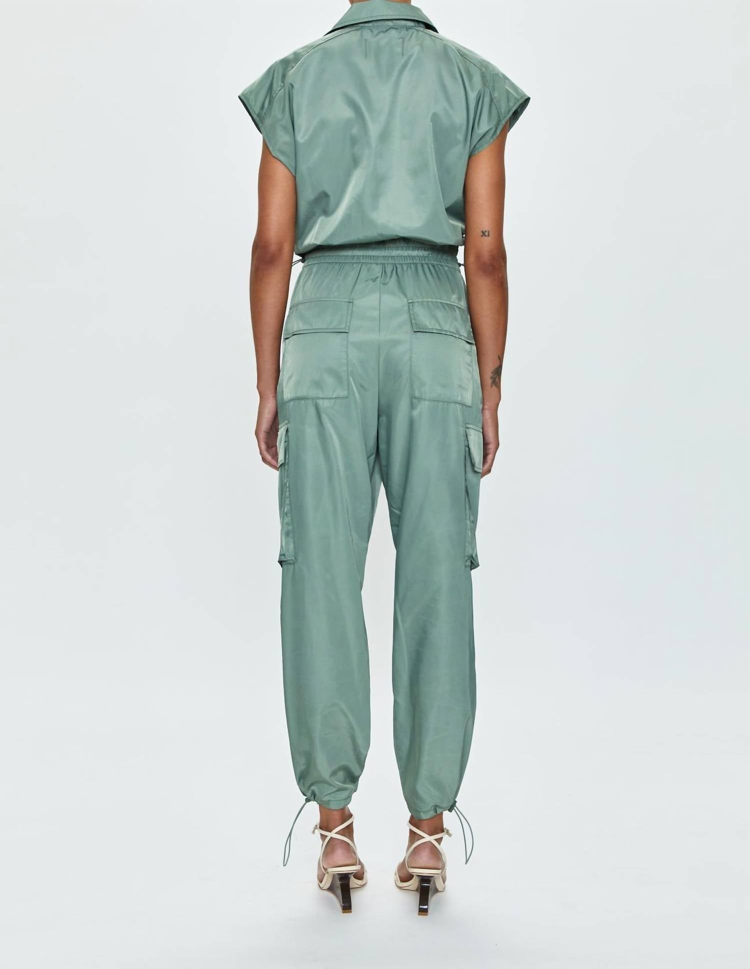 Eleve seu guarda-roupa de primavera com o Macacão Cargo Leve Jade da PISTOLA, projetado para combinar estilo e praticidade. Este macacão feminino apresenta um padrão sólido e caimento relaxado, confeccionado principalmente em nylon 100% leve com um toque de brilho para um visual elegante, além de práticos bolsos cargo. Inclui fecho de botão e fecho no tornozelo para ajuste nas pernas, oferecendo versatilidade entre um corte jogger ou reto. Importado com 30 cm de altura, 76 cm de costura interna e 42 cm de abertura nas pernas, esta peça se adapta perfeitamente à tendência de vestuário profissional, tornando-se a escolha ideal para eventos de noivado. A modelo tem 1,75 m e veste tamanho P.