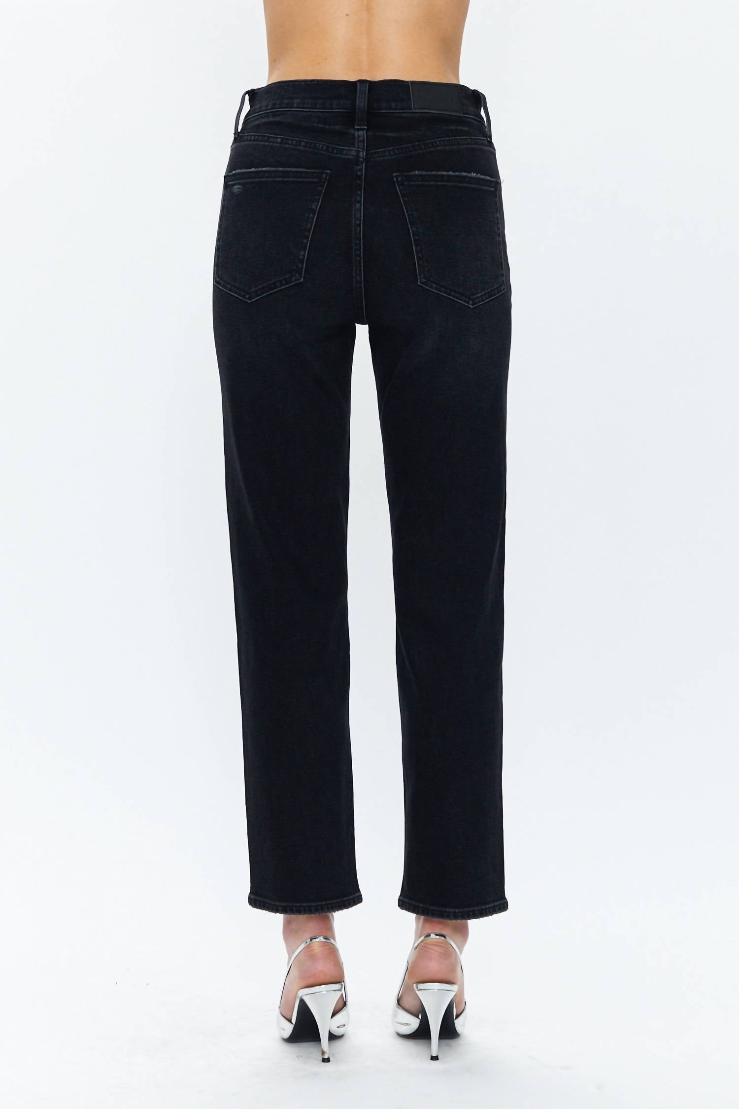 Combine esta calça jeans reta com sapatilhas, sandálias ou até mesmo saltos! Não tem como errar. Esta calça reta atemporal tem uma lavagem preta levemente desbotada com leves ondulações, em tecido elástico confortável. Botão prateado e rebites de cobre. 96% algodão, 3% elastano, 1% elastano. Lavar à máquina com água fria e cores semelhantes. Secar em temperatura baixa. Elástico confortável. Altura: 28 cm. Costura interna: 68 cm. Abertura da perna: 37 cm.