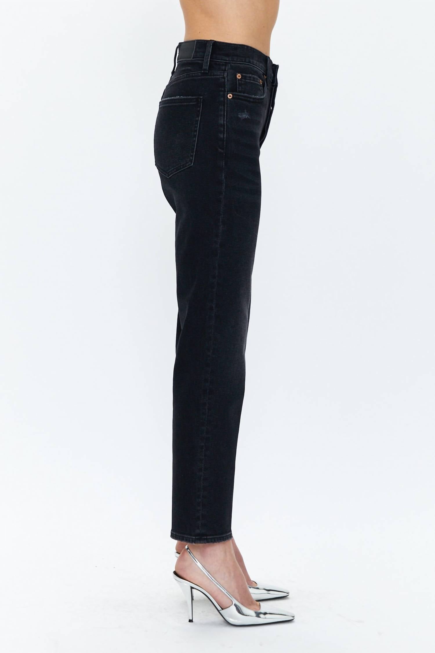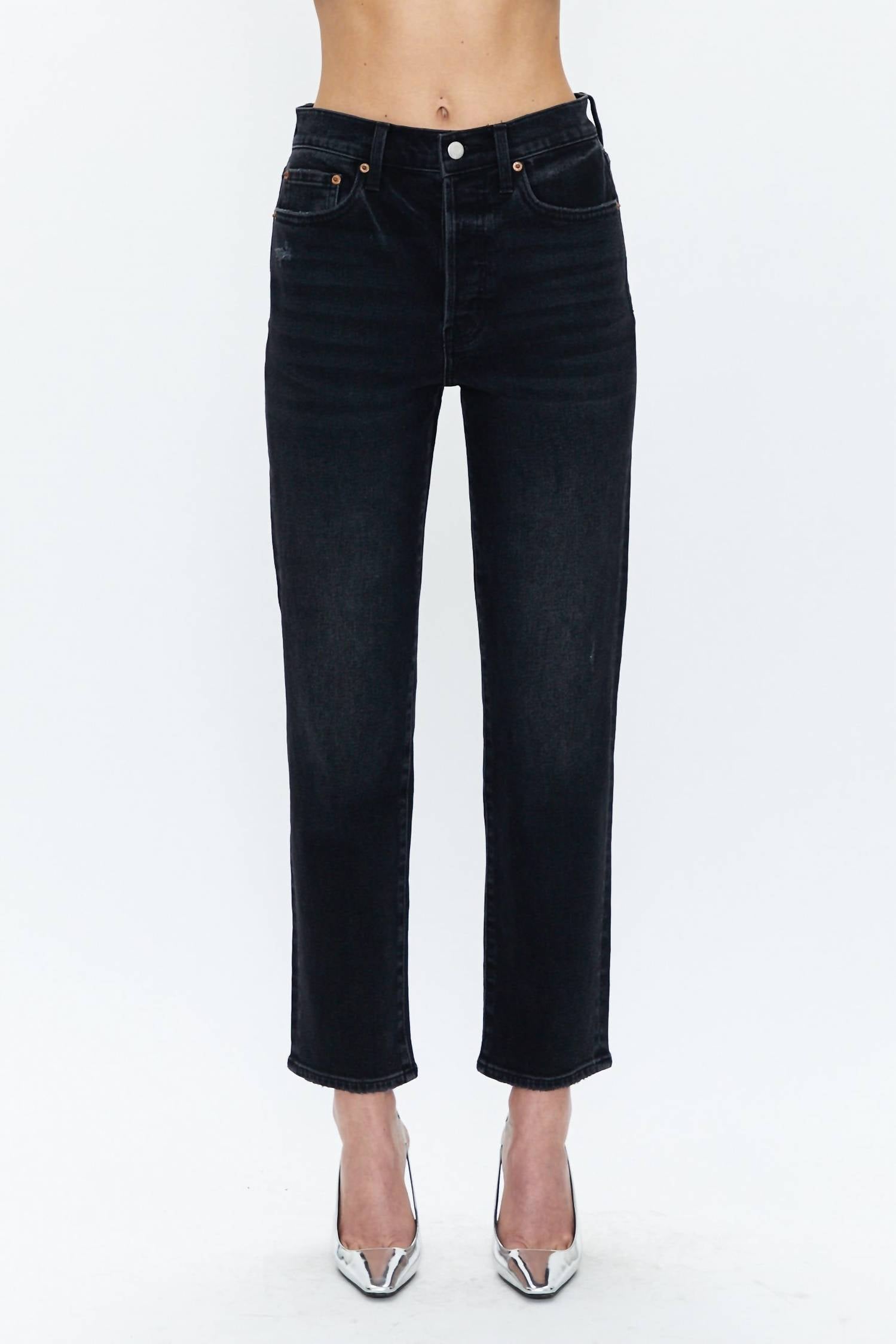Esta calça reta atemporal tem uma lavagem preta levemente desbotada com leves ondulações, em tecido elástico confortável. Botão prateado e rebites de cobre. 96% algodão, 3% elastano, 1% elastano. Lavar à máquina com água fria e cores semelhantes. Secar em temperatura baixa. Elástico confortável. Altura: 28 cm. Costura interna: 68 cm. Abertura da perna: 37 cm.