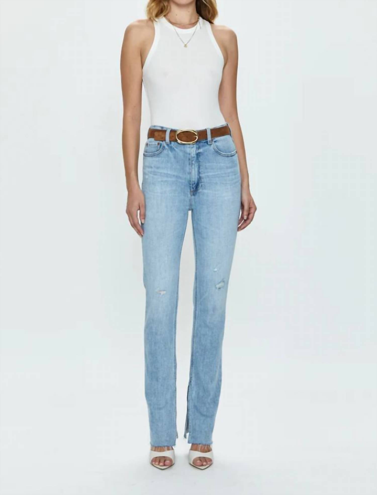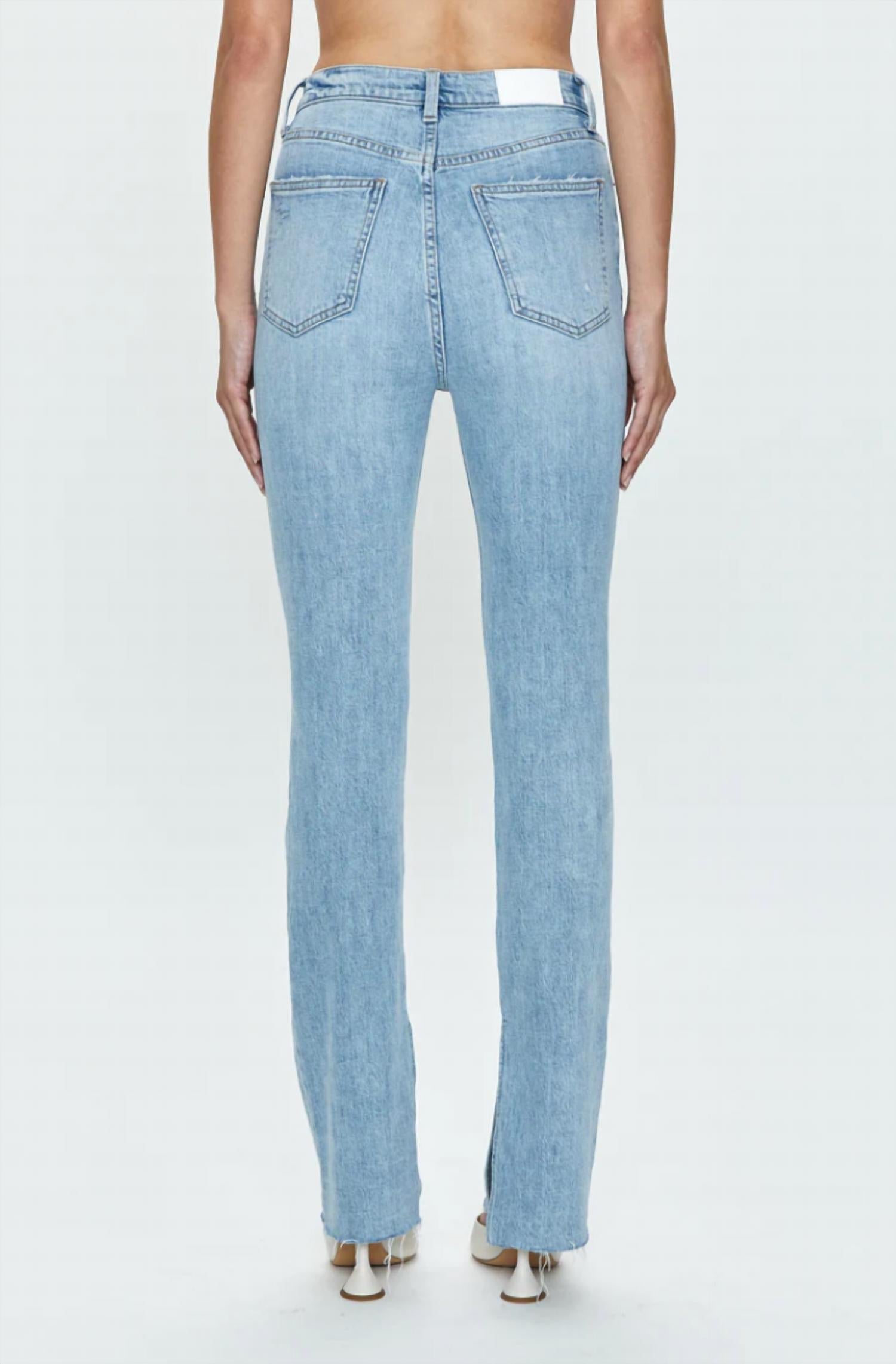 Uma calça jeans skinny que é estilosa e confortável. Adoramos esse modelo porque combina com botas, ou sem! Renove sua coleção de jeans com a Calça Jeans Colleen Tower High Rise Modern Slim Raw Split Hem da PISTOLA, com uma lavagem azul-clara contemporânea com toques de desgaste. Confeccionada em uma mistura confortável de algodão, esta calça jeans apresenta um corte slim longo com uma fenda chique no tornozelo, perfeita para destacar seus sapatos favoritos. Com 30 cm de altura, 84 cm de costura interna e 38 cm de abertura nas pernas, ela promete um caimento impecável, com bolsos práticos e fecho de botão. Os cuidados são simples, com instruções de lavagem à máquina para manter o estilo com facilidade. A modelo tem 1,75 m e veste tamanho 26.