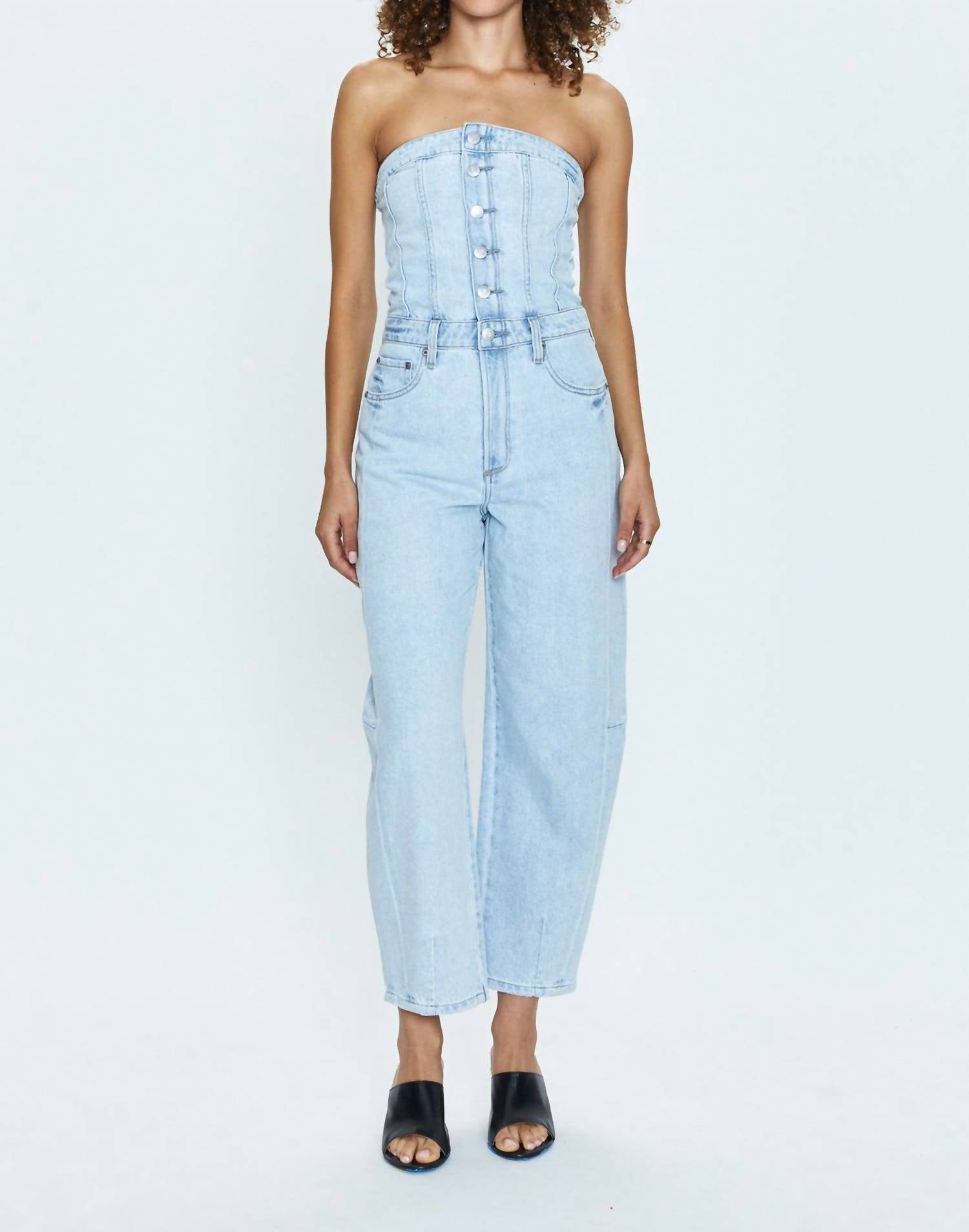 Não é preciso muito para que esta peça fique descolada sem esforço. Adicione algumas joias chamativas para dar um toque especial ou calce tênis para um visual mais casual. Conheça o Macacão Daphne com Pernas Arqueadas da PISTOLA, uma peça estilosa na cor impressionista com lavagem clara que incorpora um toque vintage. Este macacão sem alças apresenta um corpete abotoado e uma silhueta afunilada e curvada nas pernas, confeccionado em 100% algodão para um ajuste firme e sem elasticidade. Com costura interna de 68 cm e abertura de 40 cm nas pernas, garante um caimento elegante e bolsos práticos. O fechamento é feito por botão e os cuidados são simples, seguindo as instruções de lavagem à máquina. A modelo tem 1,75 m e veste tamanho P.