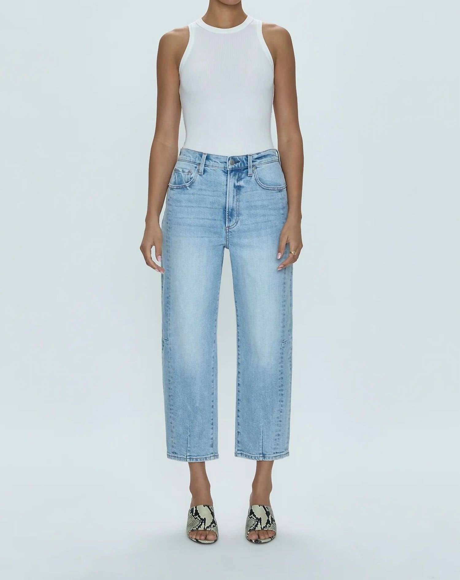 Silhueta moderna confeccionada em jeans Sun Kissed com lavagem clara, perfeita para os entusiastas do streetwear. Confeccionada em 99% algodão e 1% elastano. Oferece um caimento relaxado nas pernas, com cós alto de 32 cm e costura interna de 66 cm. O contorno elegante é acentuado por um fecho de botão, detalhes em viseira e bolsos funcionais, tudo isso contribuindo para seu charme chique. Cuide desta peça essencial do guarda-roupa lavando-a na máquina e secando-a na secadora para manter sua aparência elegante.