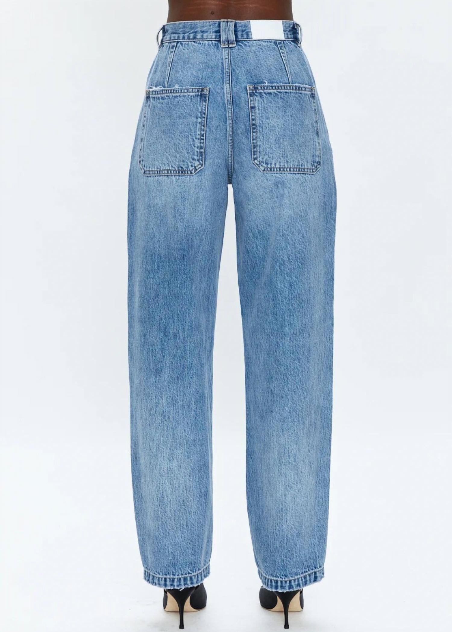 Introducing the Ezra Denim Jeans by PISTOLA in the captivating Skylark color, crafted for a stylish yet relaxed fit. These high-rise jeans feature a tapered leg style and a solid pattern, offering a modern silhouette. Composed of 100% cotton, they come with an exposed button closure for added sophistication. Perfect for making a bold fashion statement while ensuring comfort with a looser fit—consider sizing down for the ideal fit. Model is wearing a size 25.