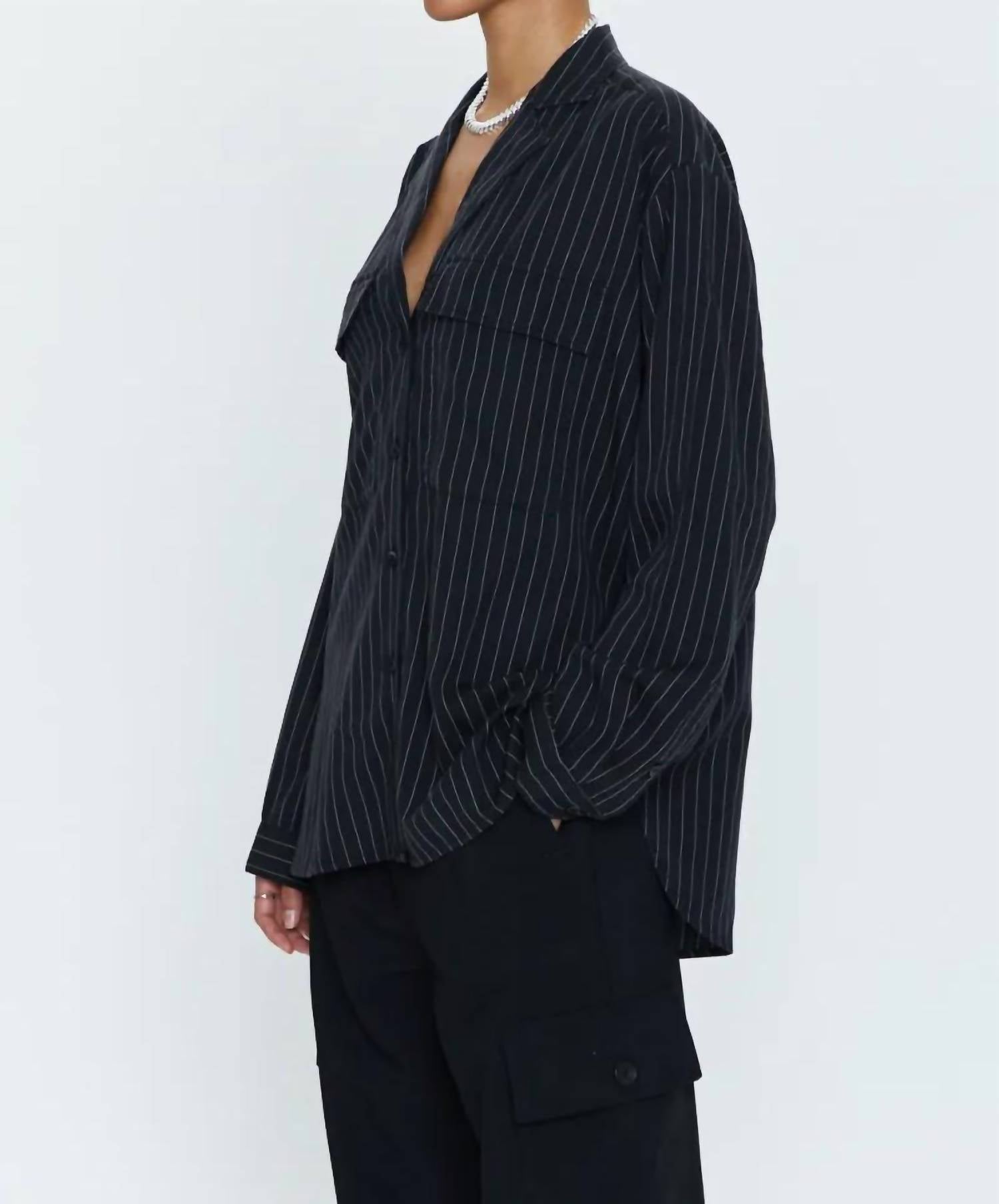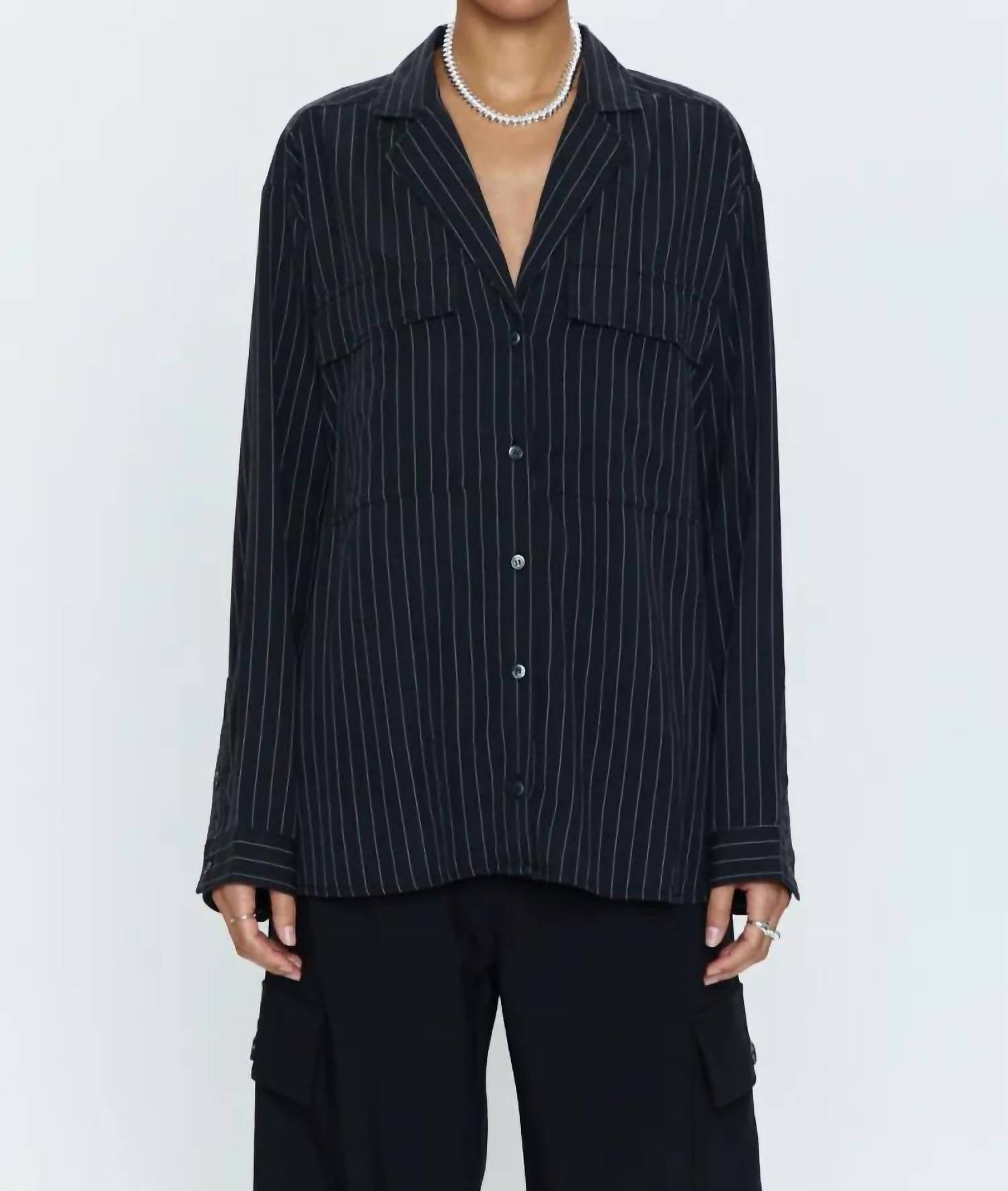 A classic button down shirt that will never go out of style. The Irene Effortless Button Down Shirt by PISTOLA offers a chic, minimalist look perfect for any holiday occasion. Crafted from Polyester, this stylish shirt features long sleeves, a classic collar, and a sophisticated black pinstripe pattern. With convenient button closure and added pockets, it fuses functionality with elegance, making it ideal for spring events like Thanksgiving holiday parties.