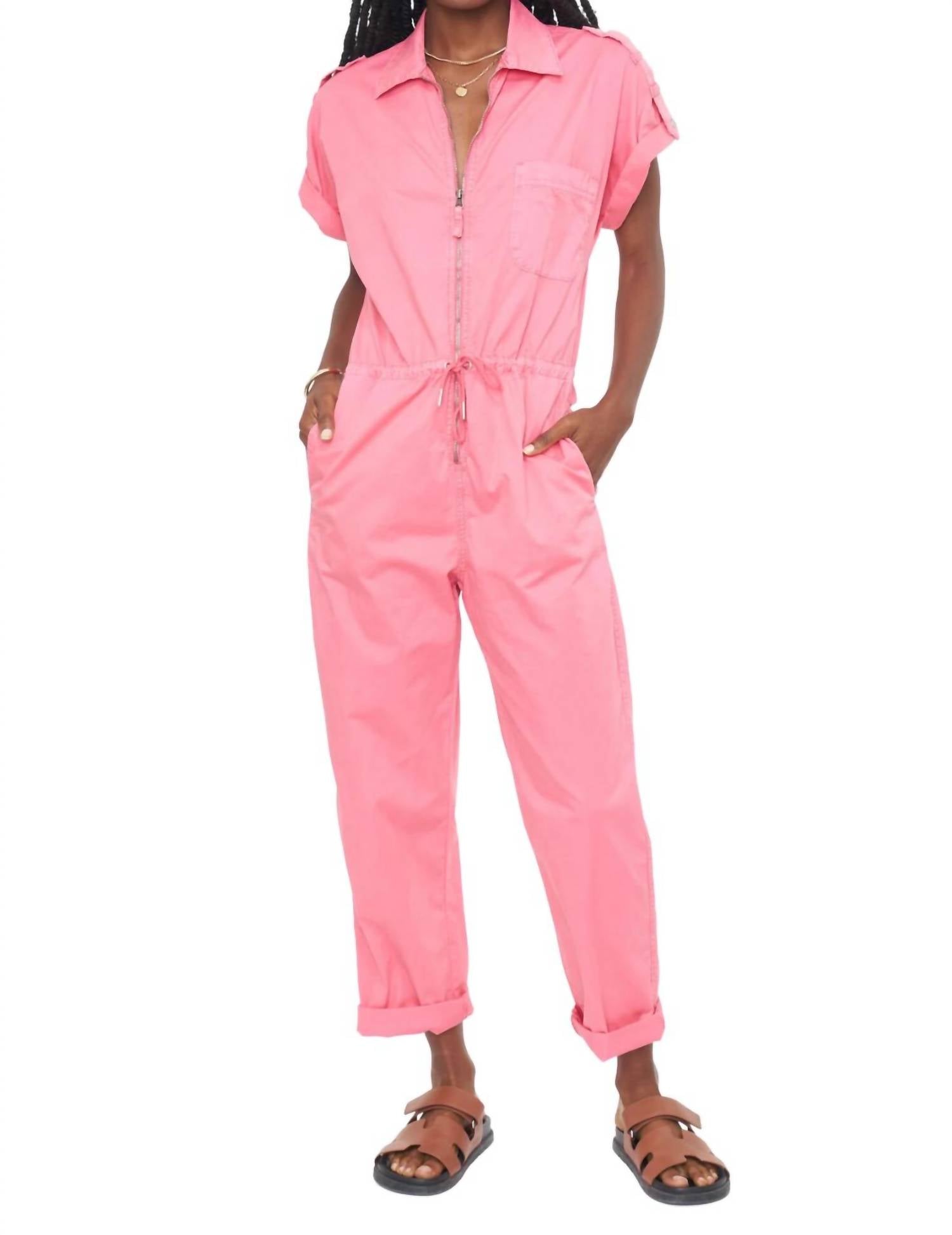 Esteja pronta do trabalho para a diversão e para tudo o mais com este macacão Jordan brilhante da Pistola. O cordão na cintura realça suas curvas e o zíper frontal permite que você escolha o quanto de pele deseja exibir. Perfeito para usar no trabalho, em passeios e em viagens de fim de semana. Características: Decote com gola. Zíper frontal e manga com punho. Cordão na cintura e bolsos laterais. Costura interna: 73 cm | Abertura da perna: 39 cm. Cor rosa vibrante. Este macacão será sua nova peça favorita do guarda-roupa. Use o seu com tudo, de tênis a saltos de tiras, para um look chique para o dia a dia. Tecido: 98% algodão, 2% elastano. A modelo está vestindo tamanho P. Altura da modelo: 1,75 m